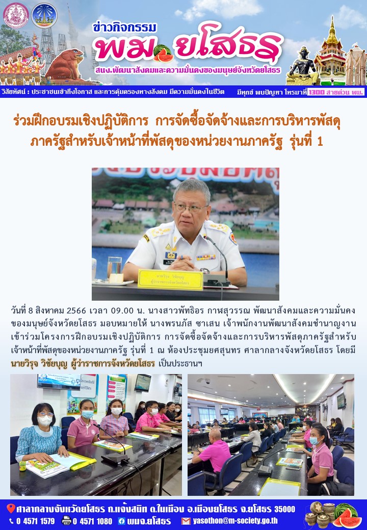 วันที่ 15 ส.ค. 2566 (22:15 น.)วันที่ 8 สิงหาคม 2566 เวลา 09.00 น. นางสาวพัทธิอร กาฬสุวรรณ พัฒนาสังคมและความมั่นคง ของมนุษย์จังหวัดยโสธร มอบหมายให้ นางพรนภัส ซาเสน เจ้าพนักงานพัฒนาสังคมชำนาญงาน เข้าร่วมโครงการฝึกอบรมเชิงปฏิบัติการ การจัดซื้อจัดจ้างและการบริหารพัสดุภาครัฐสำหรับเจ้าหน้าที่พัสดุของหน่วยงานภาครัฐ รุ่นที่ 1 ณ ห้องประชุมยศสุนทร ศาลากลางจังหวัดยโสธร โดยมี นายวิรุจ วิชัยบุญ ผู้ว่าราชการจังหวัดยโสธร เป็นประธานฯ