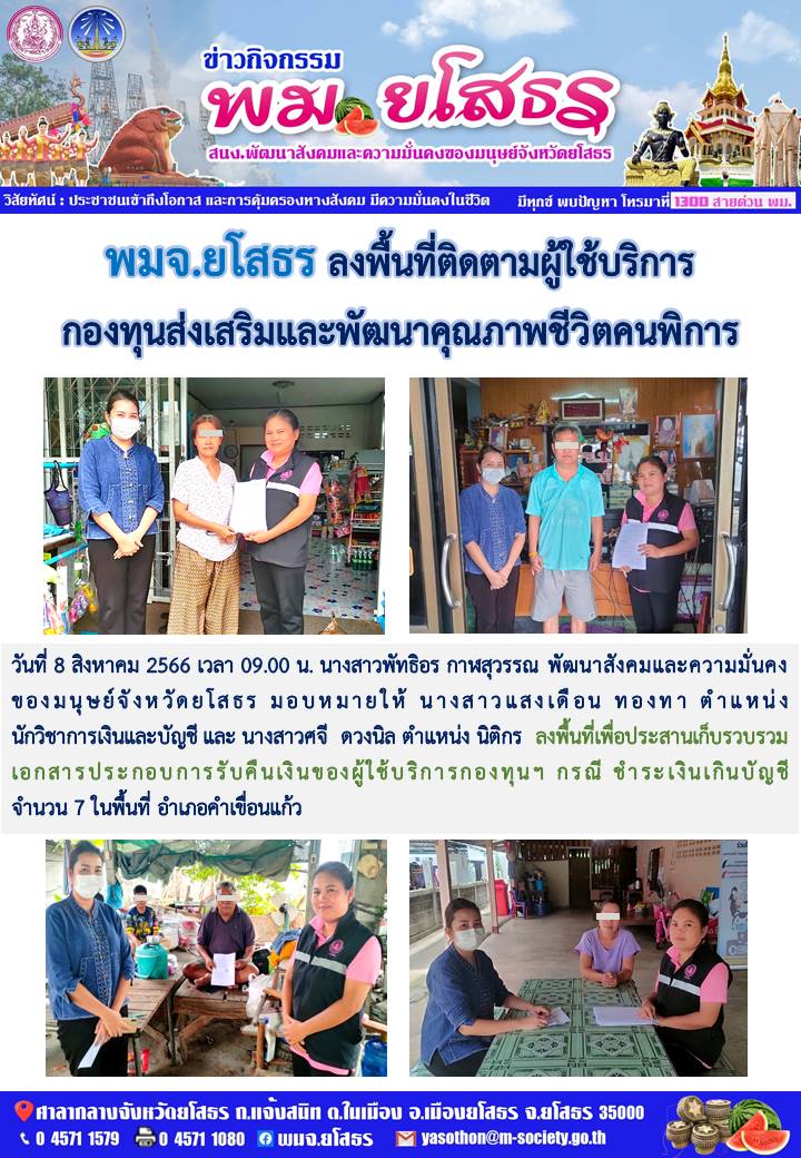 วันที่ 15 ส.ค. 2566 (22:17 น.)วันที่ 8 สิงหาคม 2566 เวลา 09.00 น. นางสาวพัทธิอร กาฬสุวรรณ พัฒนาสังคมและความมั่นคงของมนุษย์จังหวัดยโสธร มอบหมายให้ นางสาวแสงเดือน ทองทา ตำแหน่ง นักวิชาการเงินและบัญชี และ นางสาวศจี ดวงนิล ตำแหน่ง นิติกร ลงพื้นที่เพื่อประสานเก็บรวบรวมเอกสารประกอบการรับคืนเงินของผู้ใช้บริการกองทุนฯ กรณี ชำระเงินเกินบัญชี จำนวน 7 ในพื้นที่ อำเภอคำเขื่อนแก้ว