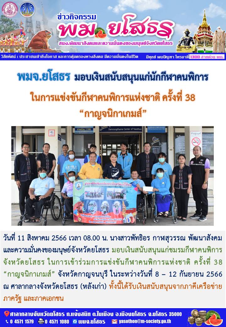 พมจ.ยโสธร มอบเงินสนับสนุนแก่ชมรมกีฬาคนพิการจังหวัดยโสธรในการเข้าร่วมการแข่งขันกีฬาคนพิการแห่งชาติ ครั้งที่ 38 “กาญจนิกาเกมส์” จังหวัดกาญจนบุรี (11 สิงหาคม 2566)