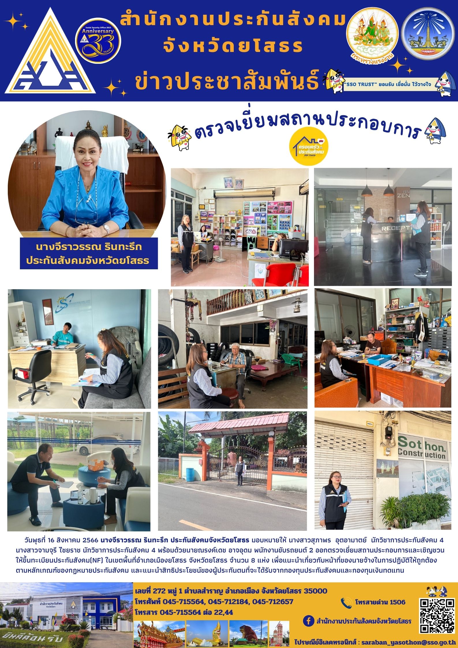 ประกันสังคมจังหวัดยโสธร มอบหมายให้ นางสาวสุภาพร อุตอามาตย์ นักวิชาการประกันสังคม 4 นางสาวจามจุรี ไชยราช นักวิชาการประกันสังคม 4 พร้อมด้วยนายณรงค์เดช อาจอุดม พนักงานขับรถยนต์ 2 ออกตรวจเยี่ยมสถานประกอบการและเชิญชวน ให้ขึ้นทะเบียนประกันสังคม(NF) ในเขต