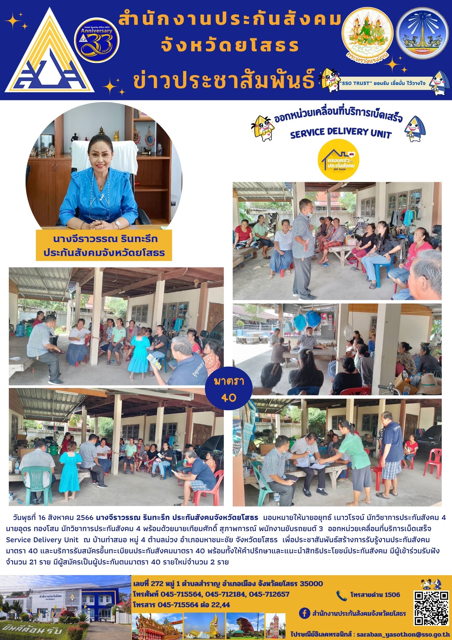 Service Delivery Unit ณ บ้านท่าสมอ หมู่ 4 ตำบลม่วง อำเภอมหาชนะชัย จังหวัดยโสธร เพื่อประชาสัมพันธ์สร้างการรับรู้งานประกันสังคม