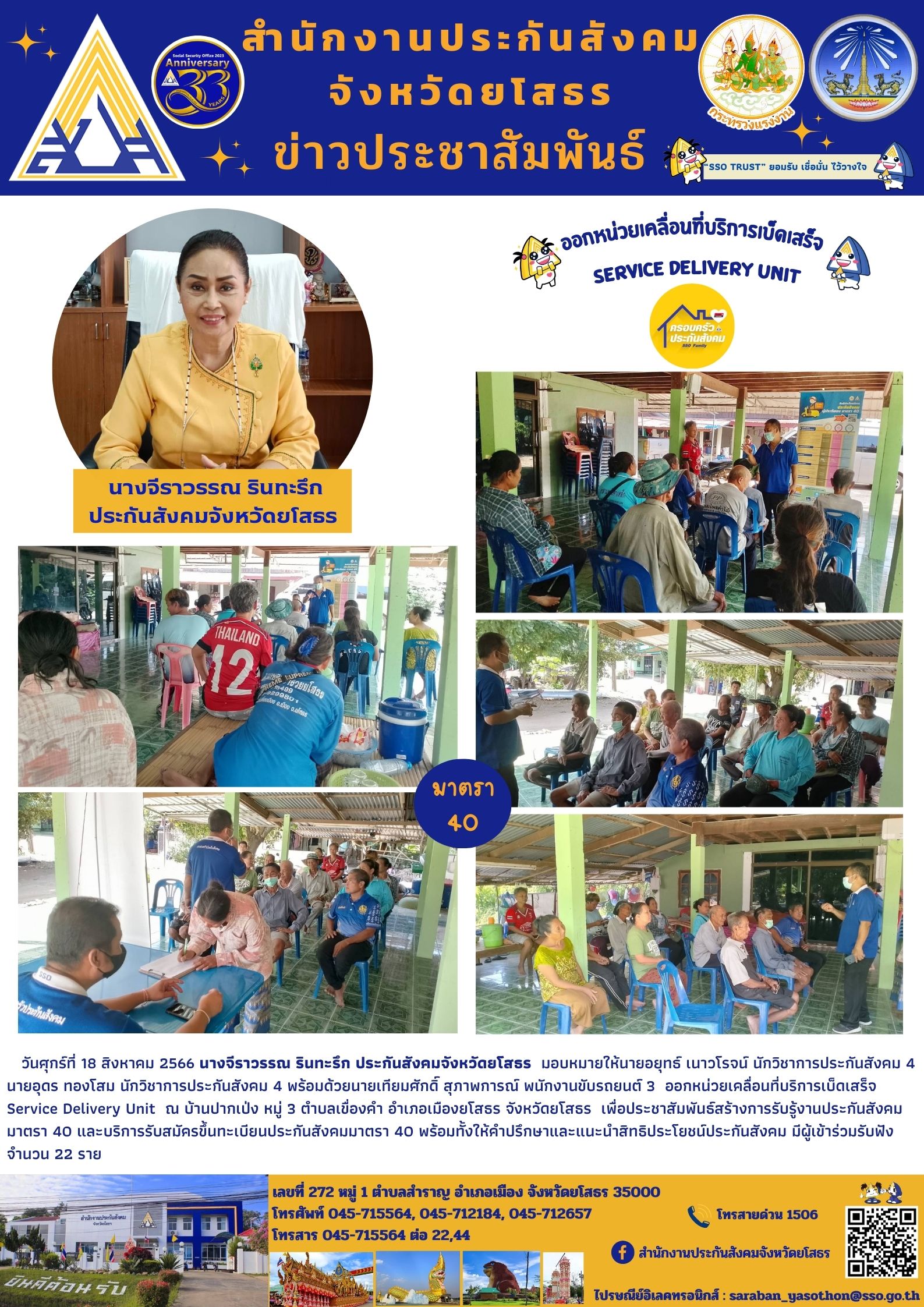 Service Delivery Unit ณ บ้านปากเป่ง หมู่ 3 ตำบลเขื่องคำ อำเภอเมืองยโสธร จังหวัดยโสธร เพื่อประชาสัมพันธ์สร้างการรับรู้งานประกันสังคม