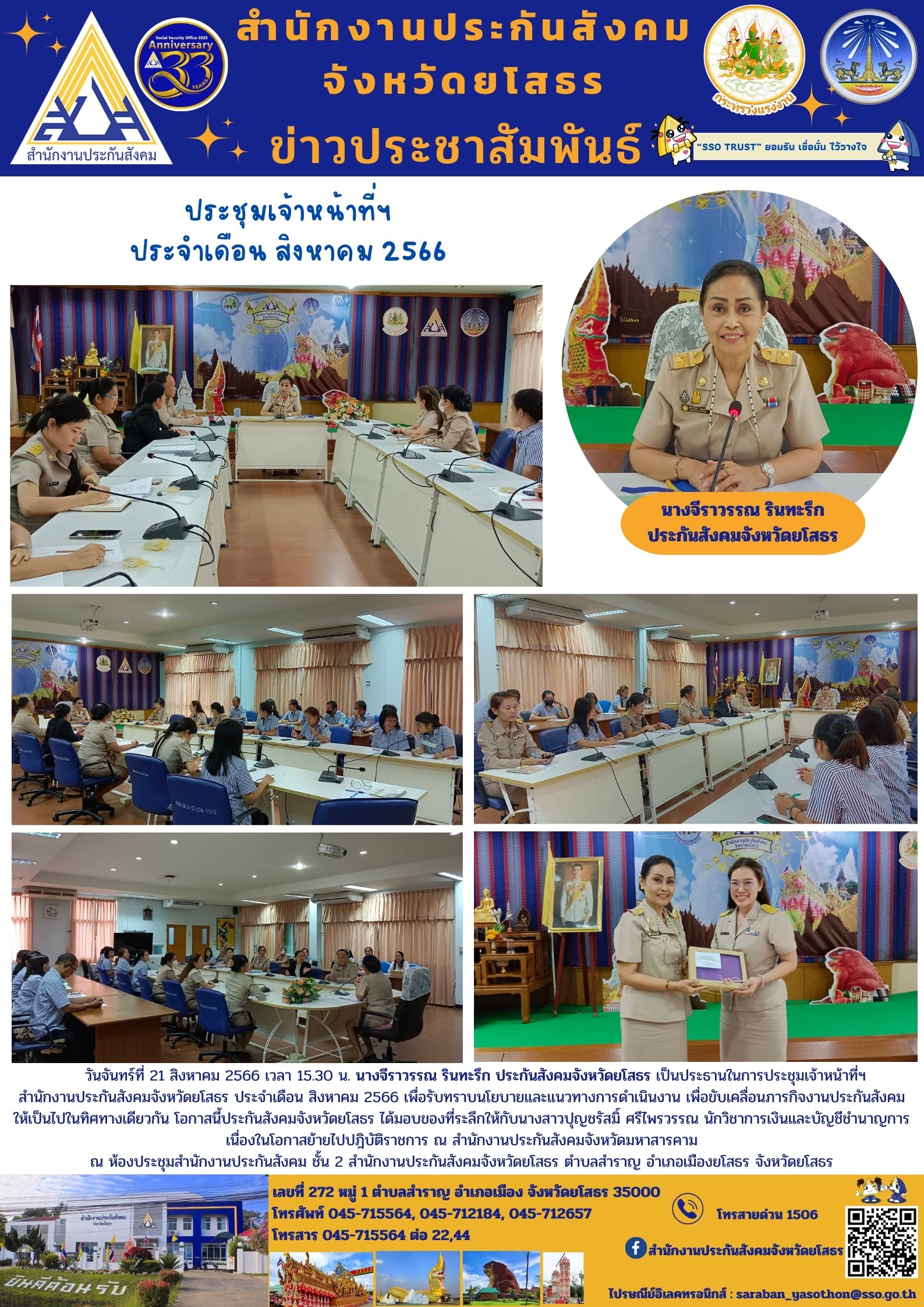 วันจันทร์ที่ 21 สิงหาคม 2566 เวลา 15.30 น. นางจีราวรรณ รินทะรึก ประกันสังคมจังหวัดยโสธร เป็นประธานในการประชุมเจ้าหน้าที่ฯ
