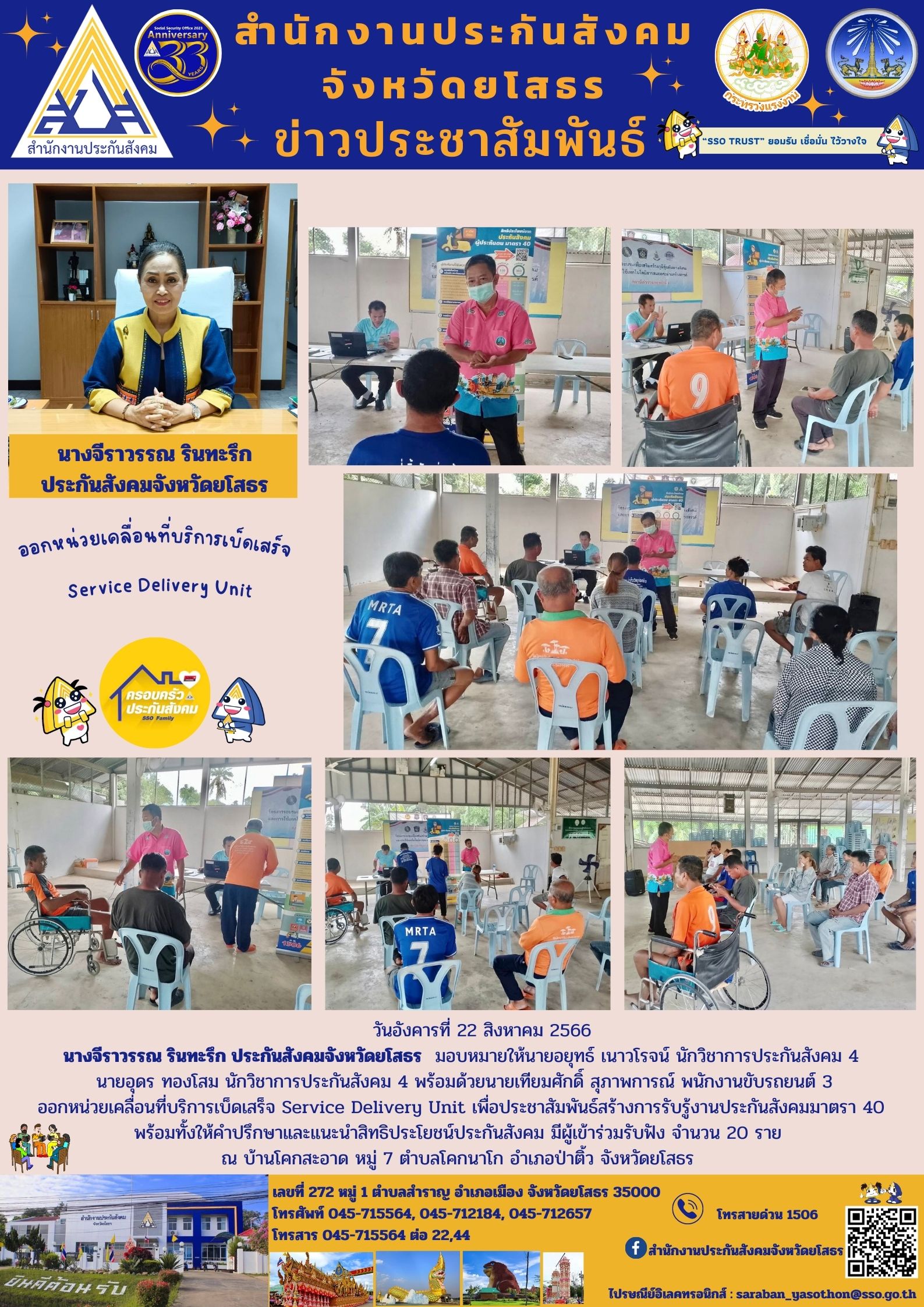 ประกันสังคมจังหวัดยโสธร มอบหมายให้นายอยุทธ์ เนาวโรจน์ นักวิชาการประกันสังคม 4 นายอุดร ทองโสม นักวิชาการประกันสังคม 4 พร้อมด้วยนายเทียมศักดิ์ สุภาพการณ์ พนักงานขับรถยนต์ 3 ออกหน่วยเคลื่อนที่บริการเบ็ดเสร็จ Service Delivery Unit เพื่อประชาสัมพันธ์สร้