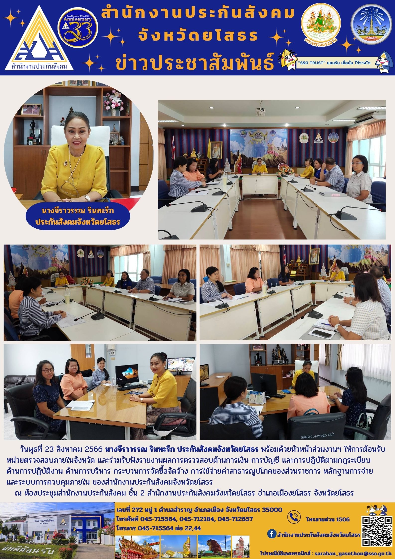 วันพุธที่ 23 สิงหาคม 2566 นางจีราวรรณ รินทะรึก ประกันสังคมจังหวัดยโสธร พร้อมด้วยหัวหน้าส่วนงานฯ ให้การต้อนรับหน่วยตรวจสอบภายในจังหวัด และร่วมรับฟังรายงานผลการตรวจสอบด้านการเงิน การบัญชี และการปฎิบัติตามกฎระเบียบ
