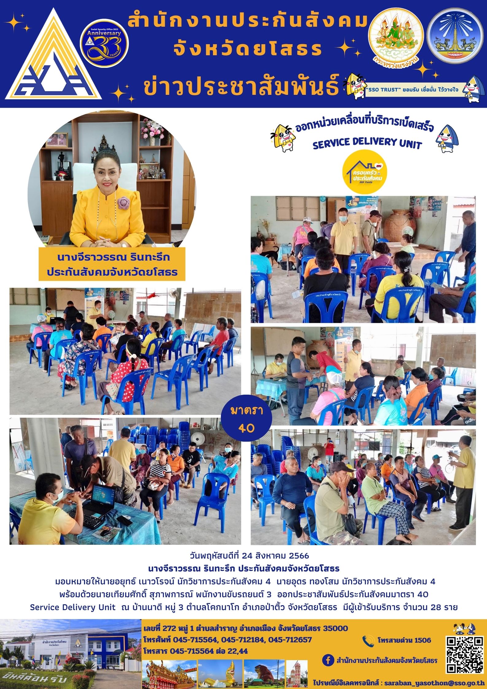 ประกันสังคมจังหวัดยโสธร มอบหมายให้นายอยุทธ์ เนาวโรจน์ นักวิชาการประกันสังคม 4 นายอุดร ทองโสม นักวิชาการประกันสังคม 4 พร้อมด้วยนายเทียมศักดิ์ สุภาพการณ์ พนักงานขับรถยนต์ 3 ออกประชาสัมพันธ์ประกันสังคมมาตรา 40 Service Delivery Unit ณ บ้านนาดี หมู่ 3