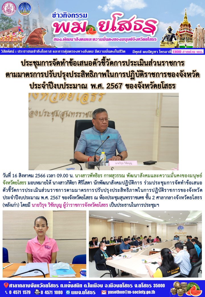 ร่วมประชุมการจัดทำข้อเสนอตัวชี้วัดการประ เมินส่วนราชการตามม าตรการปรับปรุงประสิทธิภาพในการปฏิบัติราชการของจังหวัด ประจำปีงบประมาณ พ.ศ. 2567 (16 สิงหาคม 2566)