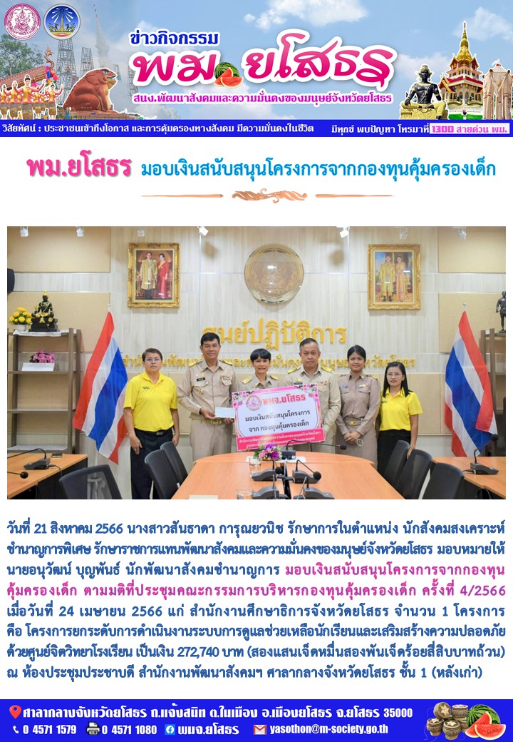 พมจ.ยโสธร มอบเงินสนับสนุนโครงการจากกองทุน คุ้มครองเด็ก ตามมติที่ประชุมคณะกรรมการบริหารกองทุนคุ้มครองเด็ก ครั้งที่ 4/2566 (21 สิงหาคม 2566)