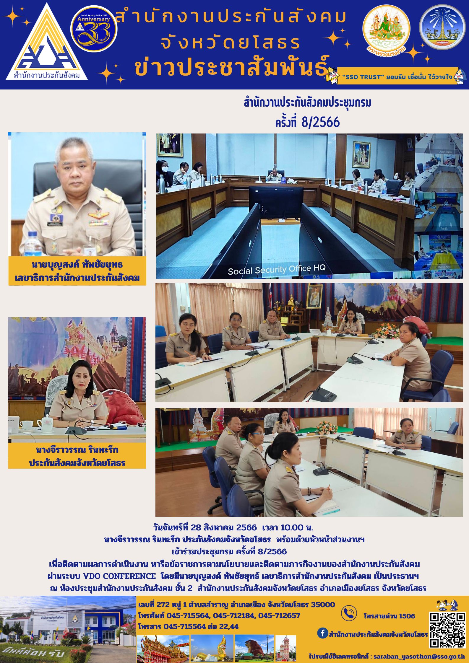 ประกันสังคมจังหวัดยโสธร พร้อมด้วยหัวหน้าส่วนงานฯ เข้าร่วมประชุมกรม ครั้งที่ 8/2566