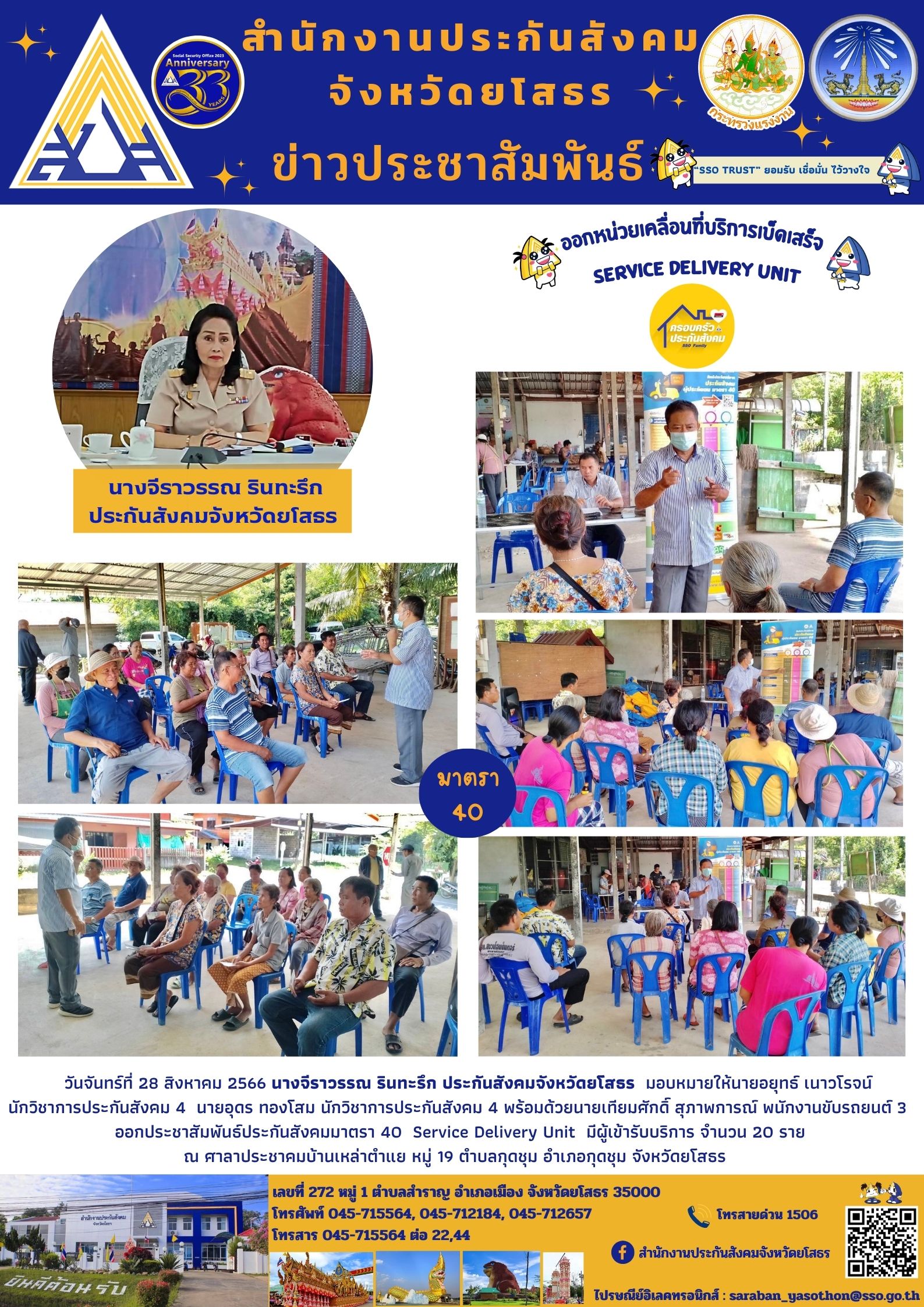 ประกันสังคมจังหวัดยโสธร มอบหมายให้นายอยุทธ์ เนาวโรจน์ นักวิชาการประกันสังคม 4 นายอุดร ทองโสม นักวิชาการประกันสังคม 4 พร้อมด้วยนายเทียมศักดิ์ สุภาพการณ์ พนักงานขับรถยนต์ 3 ออกประชาสัมพันธ์ประกันสังคมมาตรา 40 Service Delivery Unit มีผู้เข้ารับบริการ จ