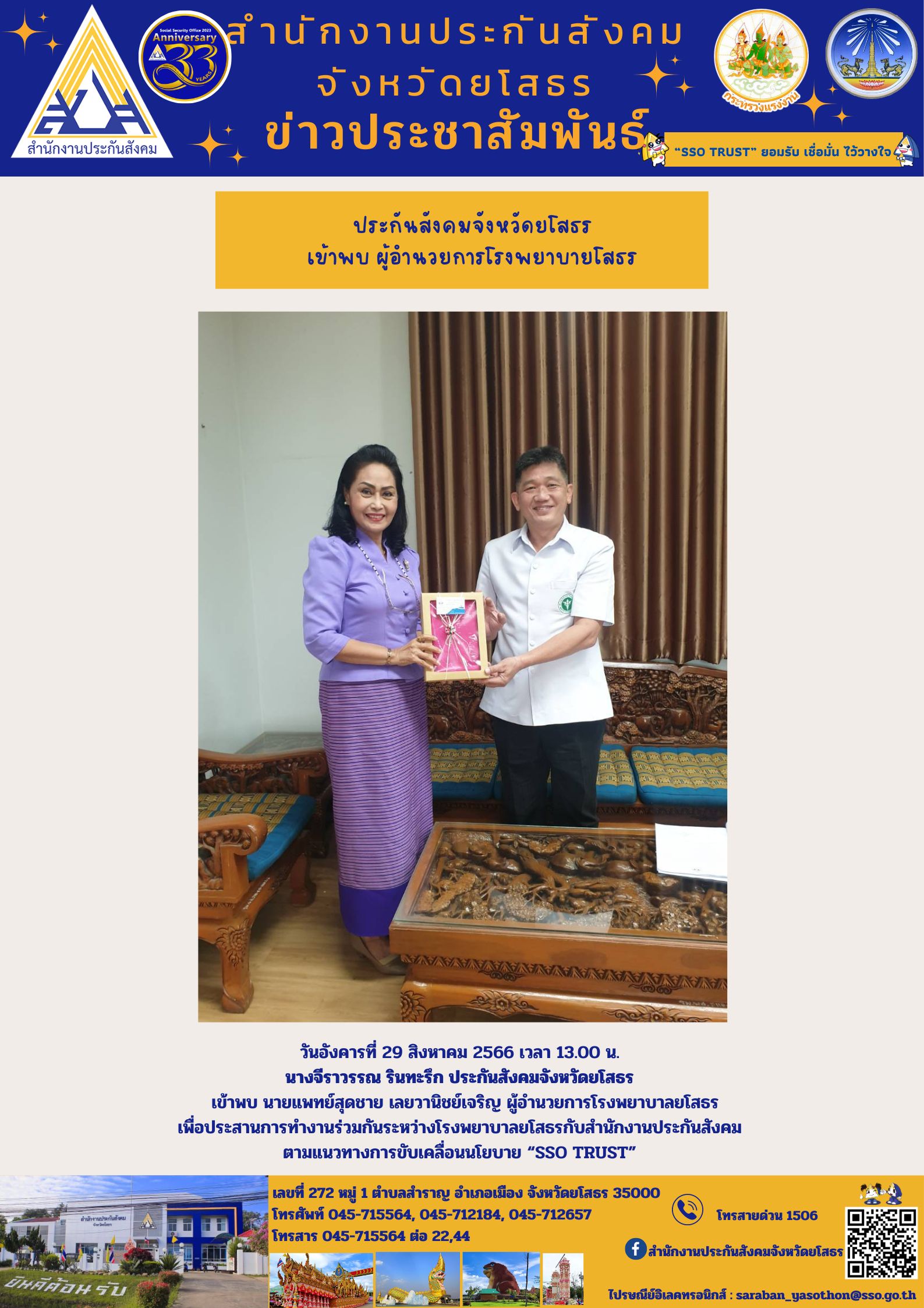วันอังคารที่ 29 สิงหาคม 2566 เวลา 13.00 น. นางจีราวรรณ รินทะรึก ประกันสังคมจังหวัดยโสธร เข้าพบ นายแพทย์สุดชาย เลยวานิชย์เจริญ ผู้อำนวยการโรงพยาบาลยโสธร เพื่อประสานการทำงานร่วมกันระหว่างโรงพยาบาลยโสธรกับสำนักงานประกันสังคม ตามแนวทางการขับเคลื่อนนโ