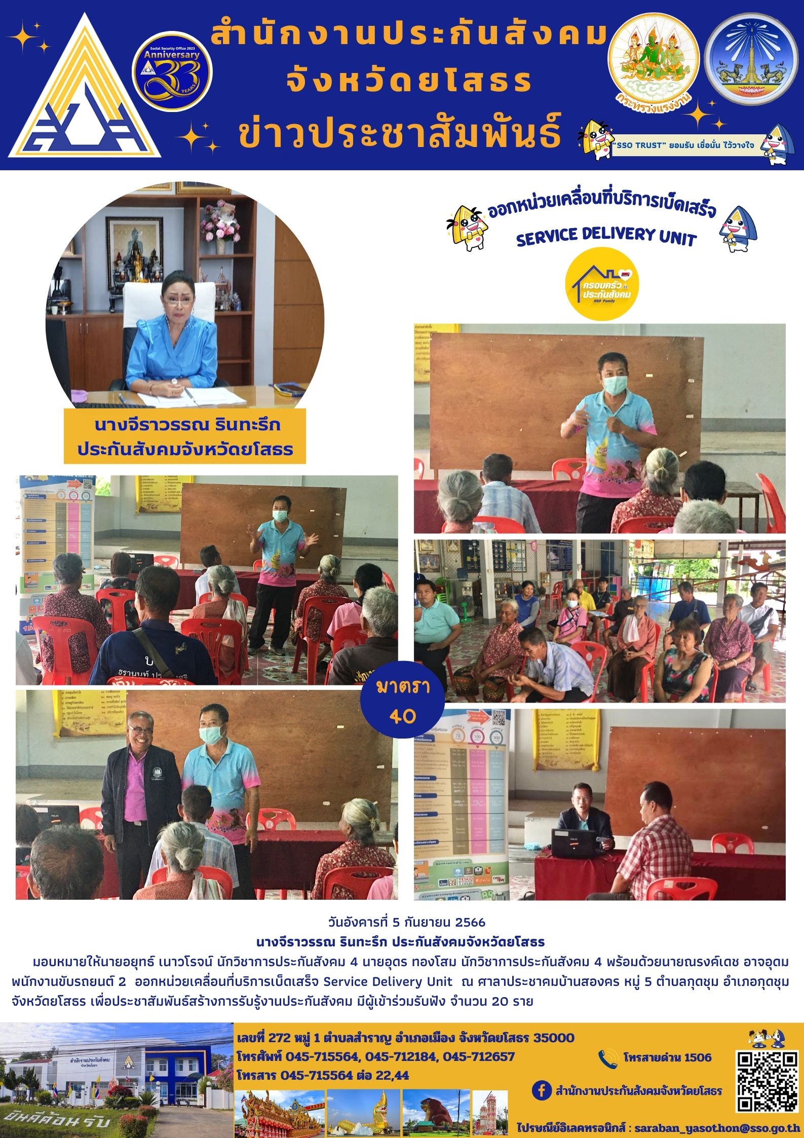 ประกันสังคมจังหวัดยโสธร มอบหมายให้นายอยุทธ์ เนาวโรจน์ นักวิชาการประกันสังคม 4 นายอุดร ทองโสม นักวิชาการประกันสังคม 4 ออกหน่วยเคลื่อนที่บริการเบ็ดเสร็จ Service Delivery Unit ณ ศาลาประชาคมบ้านสองคร หมู่ 5 ตำบลกุดชุม อำเภอกุดชุม จังหวัดยโสธร