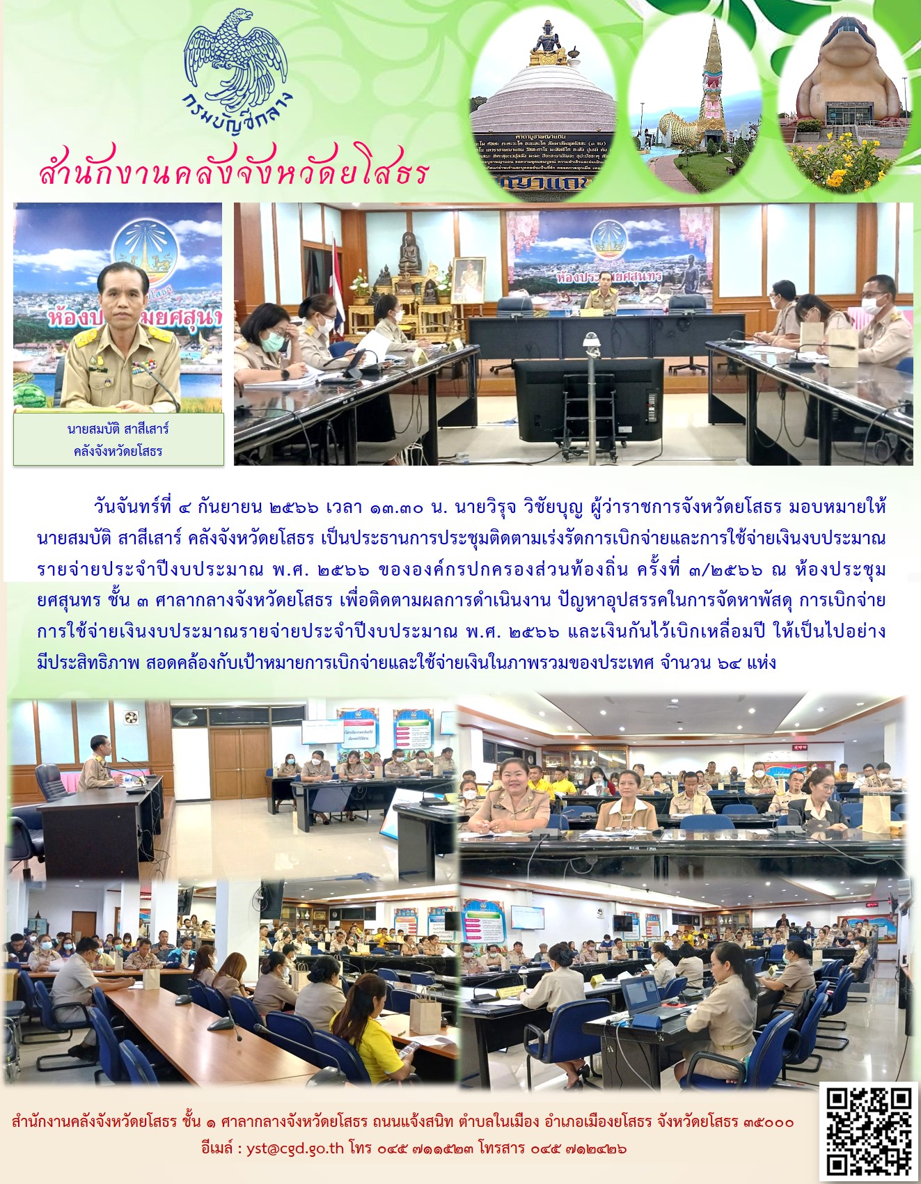 วันจันทร์ที่ 4 กันยายน 2566 เวลา 13.30 น. นายวิรุจ วิชัยบุญ ผู้ว่าราชการจังหวัดยโสธร มอบหมายให้นายสมบัติ สาสีเสาร์ คลังจังหวัดยโสธร เป็นประธานการประชุมติดตามเร่งรัดการเบิกจ่ายและการใช้จ่ายเงินงบประมาณรายจ่ายประจำปีงบประมาณ พ.ศ. 2566 ขององค์กรปกครองส