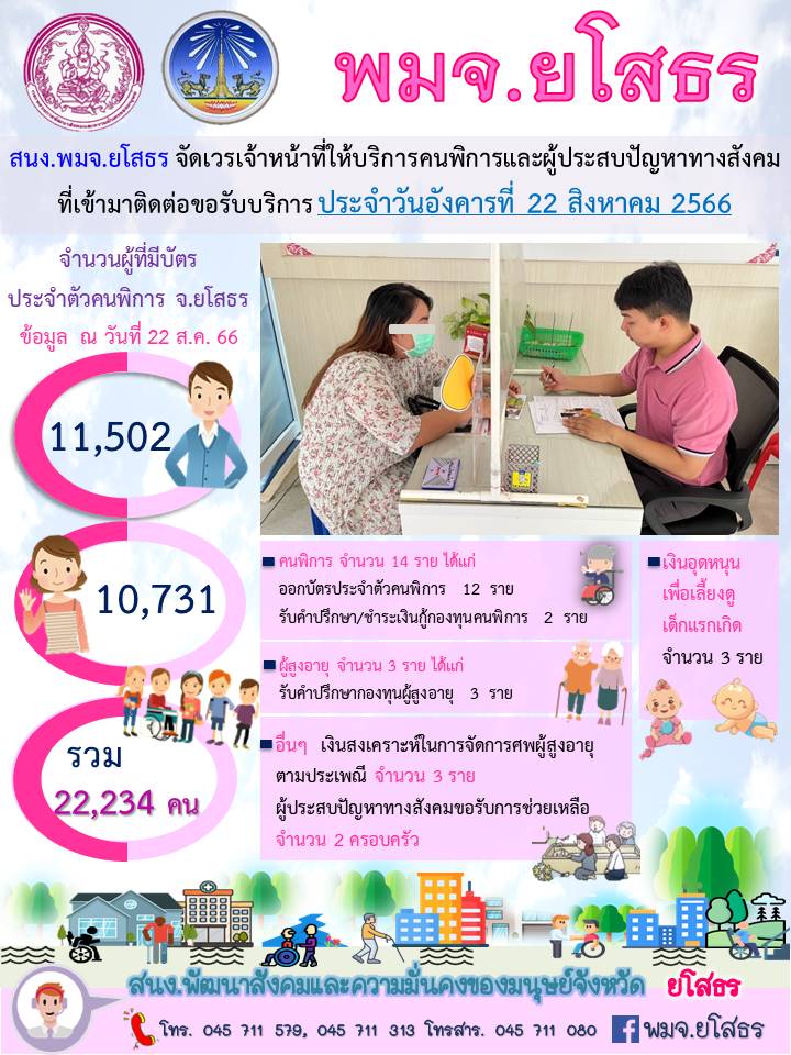 สนง.พมจ.ยโสธร จัดเวรเจ้าหน้าที่ให้บริการคนพิการและผู้ประสบปัญหาทางสังคม ที่เข้ามาติดต่อขอรับบริการ (22 สิงหาคม 2566)
