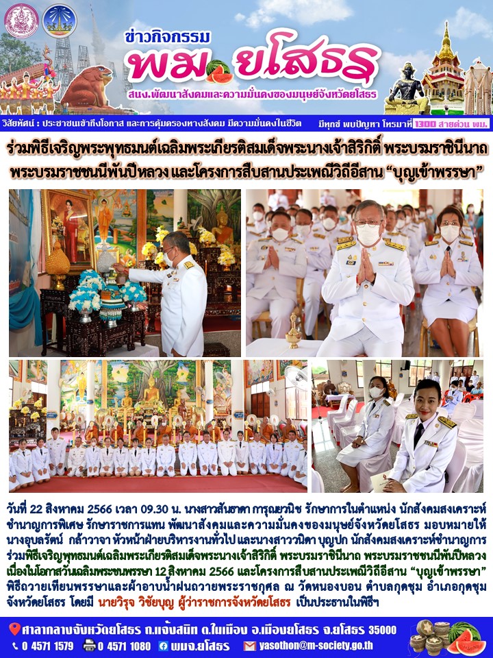 พมจ.ยโสธร ร่วมพิธีเจริญพุทธมนต์เฉลิมพระเกียรติสมเด็จพระนางเจ้าสิริกิติ์ พระบรมราชินีนาถ พระบรมราชชนนีพันปีหลวง (22 สิงหาคม 2566)