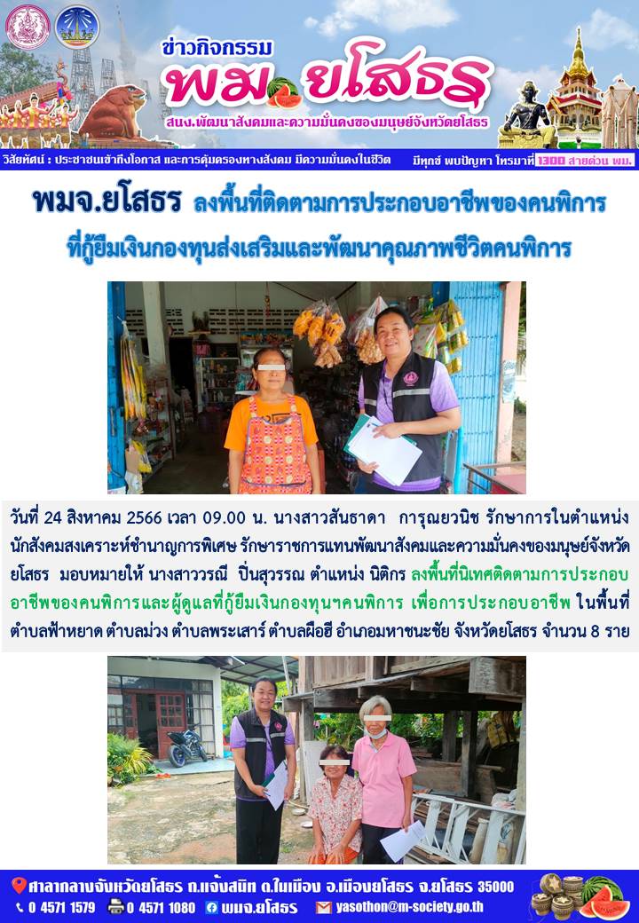 วันที่ 10 ก.ย. 2566 (15:39 น.)วันที่ 24 สิงหาคม 2566 เวลา 09.00 น. นางสาวสันธาดา การุณยวนิช รักษาการในตำแหน่ง นักสังคมสงเคราะห์ชำนาญการพิเศษ รักษาราชการแทนพัฒนาสังคมและความมั่นคงของมนุษย์จังหวัดยโสธร มอบหมายให้ นางสาววรณี ปิ่นสุวรรณ ตำแหน่ง นิติกร ลงพื้นที่นิเทศติดตามการประกอบอาชีพของคนพิการและผู้ดูแลที่กู้ยืมเงินกองทุนฯคนพิการ เพื่อการประกอบอาชีพ ในพื้นที่ ตำบลฟ้าหยาด ตำบลม่วง ตำบลพระเสาร์ ตำบลผือฮี อำเภอมหาชนะชัย จังหวัดยโสธร จำนวน 8 ราย