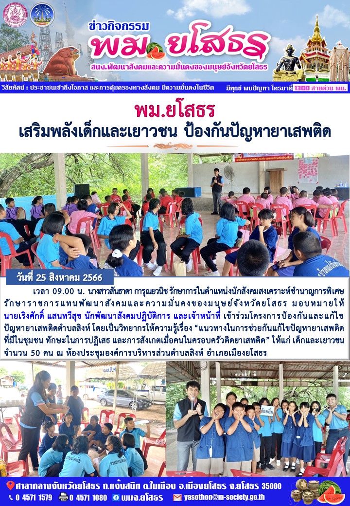 วันที่ 10 ก.ย. 2566 (15:50 น.)วันที่ 25 สิงหาคม 2566 เวลา 09.00 น. นางสาวสันธาดา กรุณยวนิช รักษาการในตำแหน่งนักสังคมสงเคราะห์ชำนาญการพิเศษ รักษาราชการแทนพัฒนาสังคมและความมั่นคงของมนุษย์จังหวัดยโสธร มอบหมายให้ นายเริงศักดิ์ แสนทวีสุข นักพัฒนาสังคมปฏิบัติการ และเจ้าหน้าที่ เข้าร่วมโครงการป้องกันและแก้ไขปัญหายาเสพติดตำบลสิงห์ โดยเป็นวิทยากรให้ความรู้เรื่อง "แนวทางในการช่วยกันแก้ไขปัญหายาเสพติดที่มีในชุมชน ทักษะในการปฏิเสธ และการสังเกตเมื่อคนในครอบครัวติดยาเสพติด" ให้แก่ เด็กและเยาวชน จำนวน 50 คน ณ ห้องประชุมองค์การบริหารส่วนตำบลสิงห์ อำเภอเมืองยโสธร