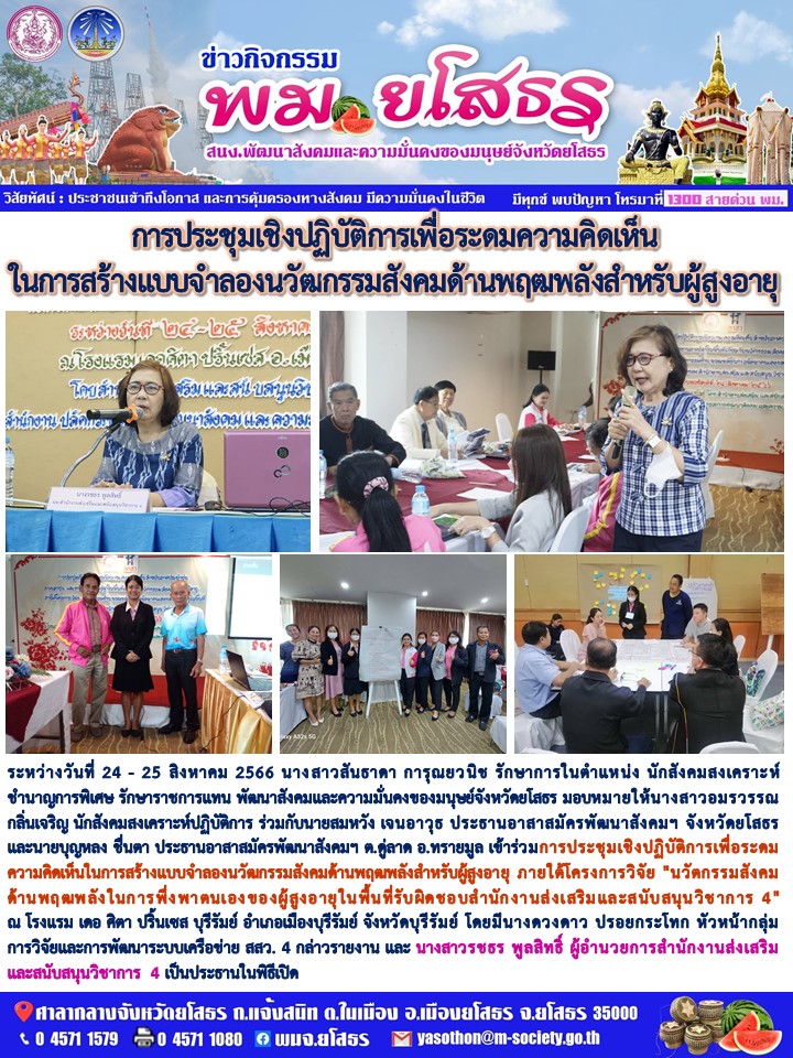 วันที่ 10 ก.ย. 2566 (15:58 น.)ระหว่างวันที่ 24 - 25 สิงหาคม 2566 นางสาวสันธาดา การุณยวนิช รักษาการในตำแหน่ง นักสังคมสงเคราะห์ชำนาญการพิเศษ รักษาราชการแทน พัฒนาสังคมและความมั่นคงของมนุษย์จังหวัดยโสธร มอบหมายให้นางสาวอมรวรรณ กลิ่นเจริญ นักสังคมสงเคราะห์ปฏิบัติการ ร่วมกับนายสมหวัง เจนอาวุธ ประธานอาสาสมัครพัฒนาสังคมฯ จังหวัดยโสธร และนายบุญหลง ชื่นตา ประธานอาสาสมัครพัฒนาสังคมฯ ต.ดู่ลาด อ.ทรายมูล เข้าร่วมการประชุมเชิญปฏิบัติการเพื่อระดมความคิดเห็นในการสร้างแบบจำลองนวัฒกรรมสังคมด้านพฤฒพลังสำหรับผู้สูงอายุ ภายใต้โครงการวิจัย "นวัตกรรมสังคมด้านพฤฒพลังในการพึ่งพาตนเองของผู้สูงอายุในพื้นที่รับผิดชอบสำนักงานส่งเสริมและสนับสนุนวิชาการ 4" ณ โรงแรม เดอ ศิตา ปริ้นเซส บุรีรัมย์ อำเภอเมืองบุรีรัมย์ จังหวัดบุรีรัมย์ โดยมีนางดวงดาว ปรอยกระโทก หัวหน้ากลุ่มการวิจัยและการพัฒนาระบบเครือข่าย สสว. 4 กล่าวรายงาน และ นางสาวรชธร พูลสิทธิ์ ผู้อำนวยการสำนักงานส่งเสริมและสนับสนุนวิชาการ 4 เป็นประธานในพิธีเปิด