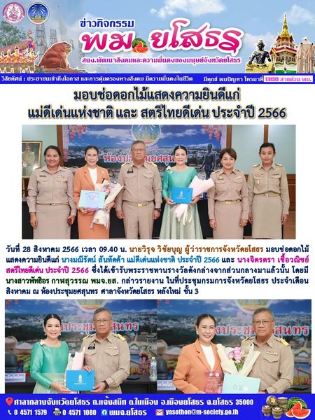 วันที่ 10 ก.ย. 2566 (18:05 น.)วันที่ 28 สิงหาคม 2566 เวลา 09.40 น. นายวิรุจ วิชัยบุญ ผู้ว่าราชการจังหวัดยโสธร มอบช่อดอกไม้แสดงความยินดีแก่ นางมณีรัตน์ สันทัดค้า แม่ดีเด่นแห่งชาติ ประจำปี 2566 และ นางจิตรตรา เชื้อวณิชย์ สตรีไทยดีเด่น ประจำปี 2566 ซึ่งได้เข้ารับพระราชทานรางวัลดังกล่างจากส่วนกลางมาแล้วนั้น โดยมี นางสาวพัทธิอร กาฬสุวรรณ พมจ.ยส. กล่าวรายงาน ในที่ประชุมกรมการจังหวัดยโสธร ประจำเดือน สิงหาคม ณ ห้องประชุมยศสุนทร ศาลาจังหวัดยโสธร หลังใหม่ ชั้น 3