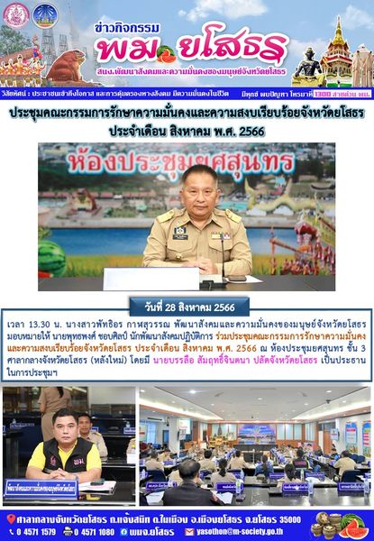 ร่วมประชุมคณะกรรมการรักษาความมั่นคงและความสงบเรียบร้อยจังหวัดยโสธร ประจำเดือน สิงหาคม พ.ศ. 2566 (28 สิงหาคม 2566)