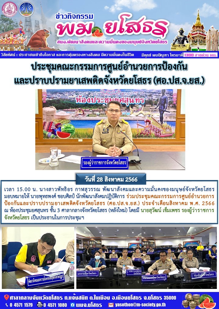 ประชุมคณะกรรมการศูนย์อำนวยการป้องกันและปราบปรามยาเสพติดจังหวัดยโสธร (ศอ.ปส.จ.ยส.) ประจำเดือนสิงหาคม พ.ศ. 2566 (28 สิงหาคม 2566)