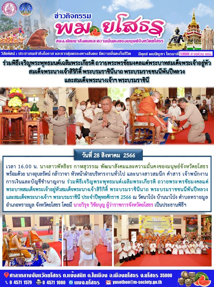 วันที่ 10 ก.ย. 2566 (18:16 น.)วันที่ 28 สิงหาคม 2566 เวลา 16.00 น. นางสาวพัทธิอร กาฬสุวรรณ พัฒนาสังคมและความมั่นคงของมนุษย์จังหวัดยโสธร พร้อมด้วย นางอุบลรัตน์ กล้าวาจา หัวหน้าฝ่ายบริหารงานทั่วไป และนางสาวสมนึก คำสาร เจ้าพนักงานการเงินและบัญชีชำนาญงาน ร่วมพิธีเจริญพระพุทธมนต์เฉลิมพระเกียรติ ถวายพระพรชัยมงคลแด่พระบาทสมเด็จพระเจ้าอยู่หัวสมเด็จพระนางเจ้าสิริกิติ์ พระบรมราชินีนาถ พระบรมราชชนนีพันปีหลวง และสมเด็จพระนางเจ้าฯ พระบรมราชินี ประจำปีพุทธศักราช 2566 ณ วัดนาโป่ง บ้านนาโป้ง ตำบลทรายมูล อำเภอทรายมูล จังหวัดยโสธร โดยมี นายวิรุจ วิชัยบุญ ผู้ว่าราชการจังหวัดยโสธร เป็นประธานพิธีฯ