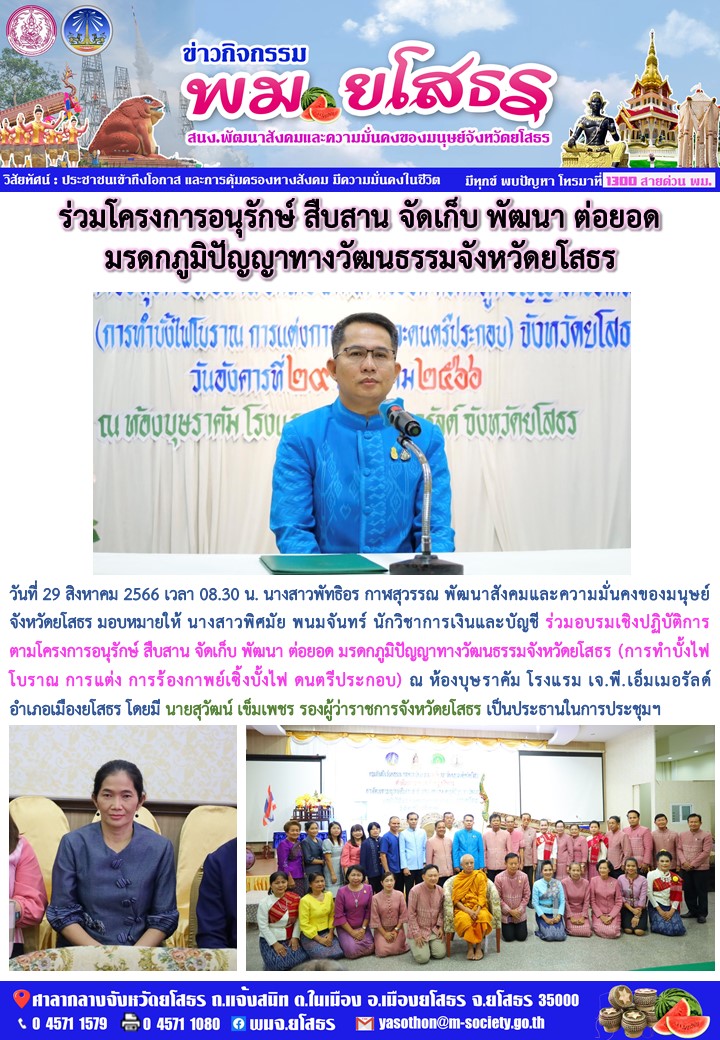 ร่วมอบรมเชิงปฏิบัติการตามโครงการอนุรักษ์ สืบสาน จัดเก็บ พัฒนา ต่อยอด มรดกภูมิปัญญาทางวัฒนธรรมจังหวัดยโสธร (29 สิงหาคม 2566)