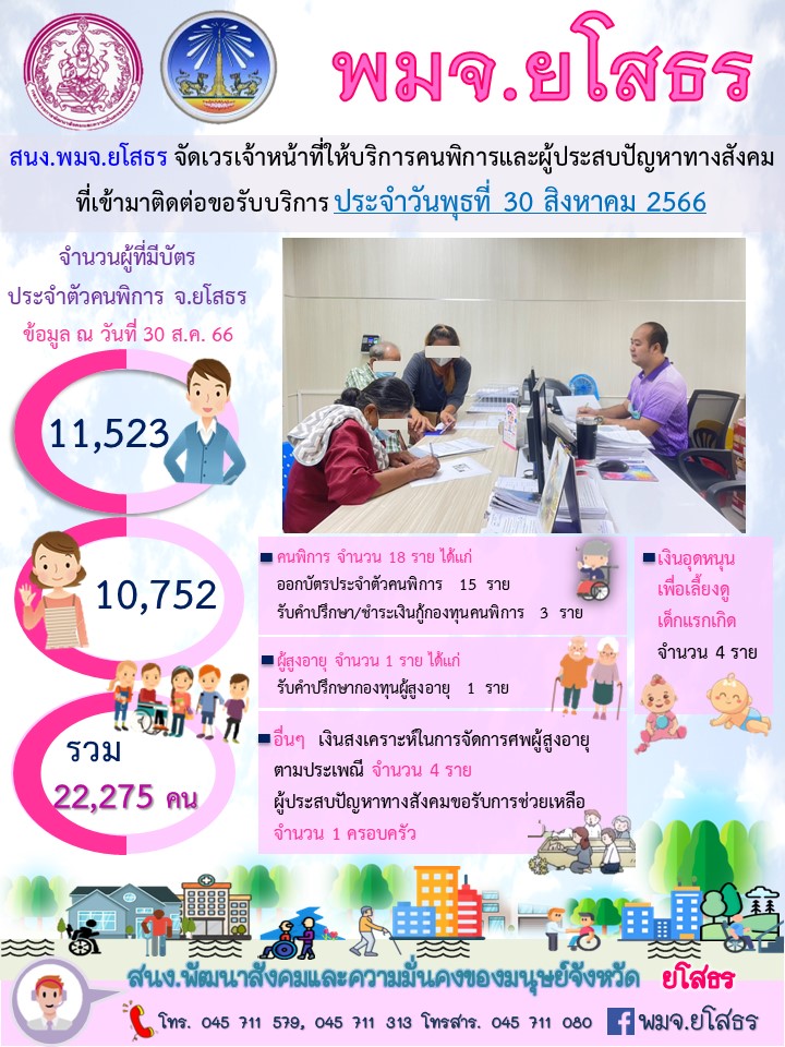 สนง.พมจ.ยโสธร จัดเวรเจ้าหน้าที่ให้บริการคนพิการและผู้ประสบปัญหาทางสังคม ที่เข้ามาติดต่อขอรับบริการ (30 สิงหาคม 2566)
