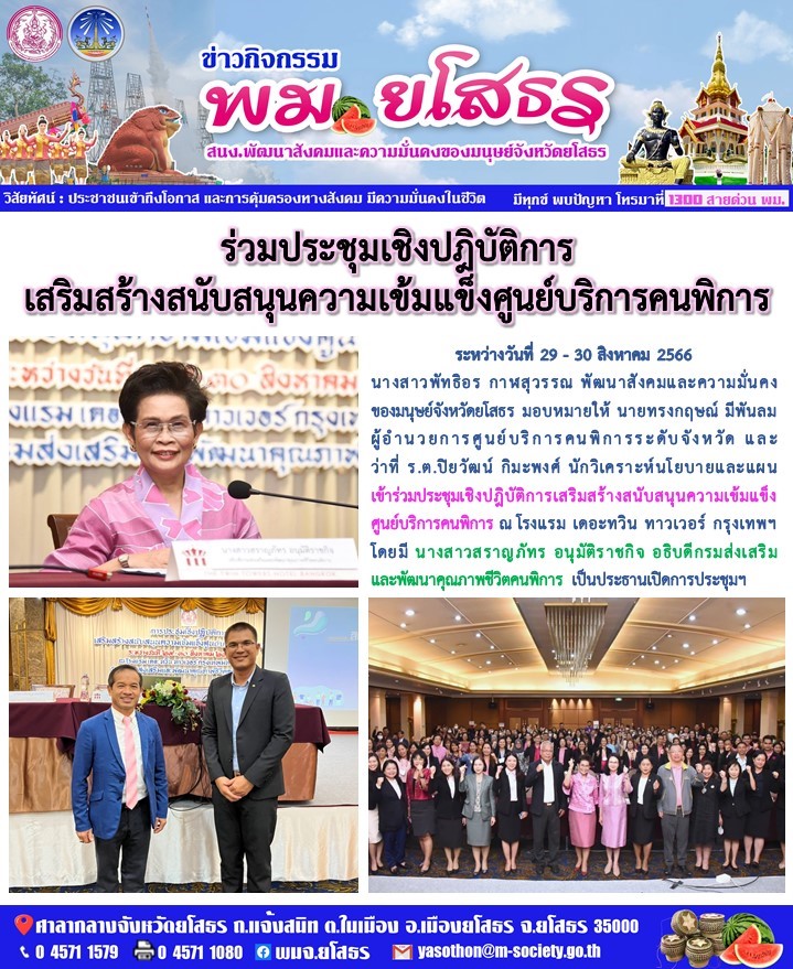 วันที่ 10 ก.ย. 2566 (18:42 น.)ระหว่างวันที่ 29 - 30 สิงหาคม 2566 นางสาวพัทธิอร กาฬสุวรรณ พัฒนาสังคมและความมั่นคงของมนุษย์จังหวัดยโสธร มอบหมายให้ นายทรงกฤษณ์ มีพันลม ผู้อำนวยการศูนย์บริการคนพิการระดับจังหวัด และว่าที่ ร.ต.ปิยวัฒน์ กิมะพงศ์ นักวิเคราะห์นโยบายและแผน เข้าร่วมประชุมเชิงปฎิบัติการเสริมสร้างสนับสนุนความเข้มแข็งศูนย์บริการคนพิการ ณ โรงแรม เดอะทวิน ทาวเวอร์ กรุงเทพฯ โดยมี นางสาวสราญภัทร อนุมัติราชกิจ อธิบดีกรมส่งเสริมและพัฒนาคุณภาพชีวิตคนพิการ เป็นประธานเปิดการประชุมฯ