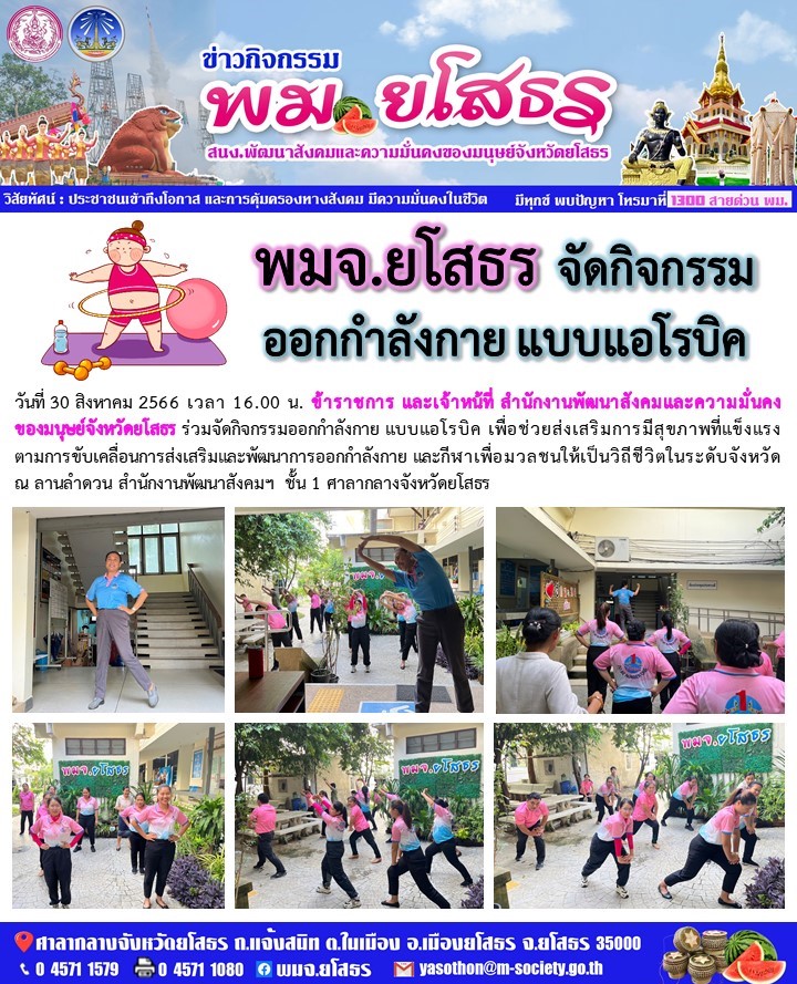 พมจ.ยโสธร ร่วมจัดกิจกรรมออกกำลังกาย แบบแอโรบิค (30 สิงหาคม 2566)