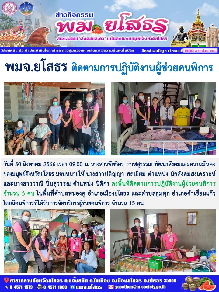 พมจ.ยโสธร ลงพื้นที่ติดตามการปฏิบัติงานผู้ช่วยคนพิการ (30 สิงหาคม 2566)
