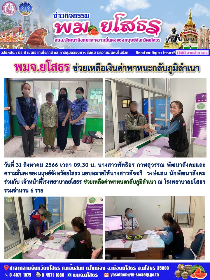พมจ.ยโสธร ช่วยเหลือค่าพาหนะกลับภูมิลำเนา (31 สิงหาคม 2566)