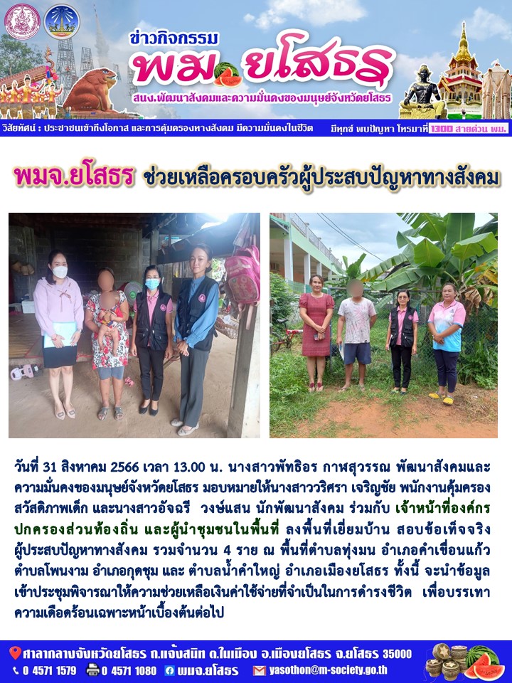 พมจ.ยโสธร ลงพื้นที่เยี่ยมบ้านสอบข้อเท็จจริงผู้ประสบปัญหาทางสังคม (31 สิงหาคม 2566)