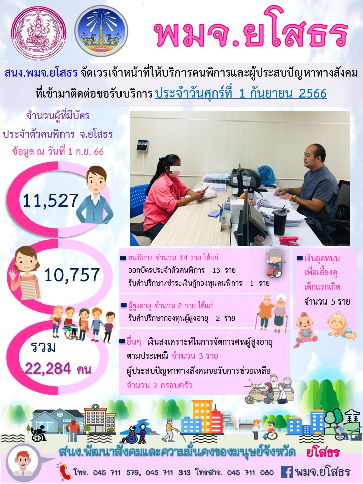 สนง.พมจ.ยโสธร จัดเวรเจ้าหน้าที่ให้บริการคนพิการและผู้ประสบปัญหาทางสังคม ที่เข้ามาติดต่อขอรับบริการ (1 กันยายน 2566)