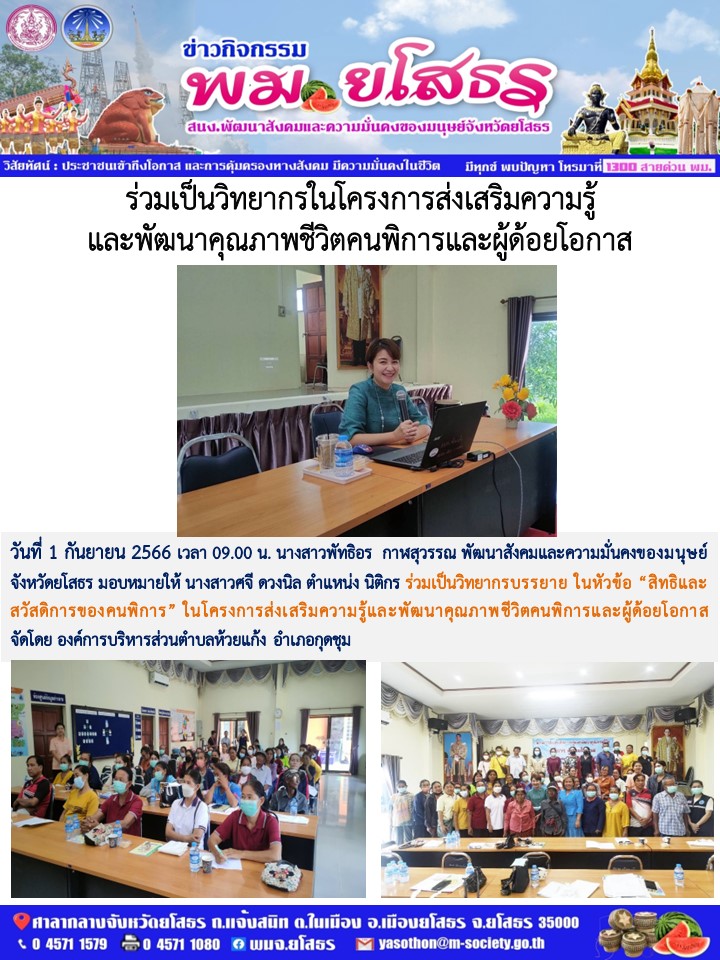 วันที่ 10 ก.ย. 2566 (19:10 น.)วันที่ 1 กันยายน 2566 เวลา 09.00 น. นางสาวพัทธิอร กาฬสุวรรณ พัฒนาสังคมและความมั่นคงของมนุษย์จังหวัดยโสธร มอบหมายให้ นางสาวศจี ดวงนิล ตำแหน่ง นิติกร ร่วมเป็นวิทยากรบรรยาย ในหัวข้อ “สิทธิและสวัสดิการของคนพิการ” ในโครงการส่งเสริมความรู้และพัฒนาคุณภาพชีวิตคนพิการและผู้ด้อยโอกาส จํดโดย องค์การบริหารส่วนตำบลห้วยแก้ง อำเภอกุดชุม