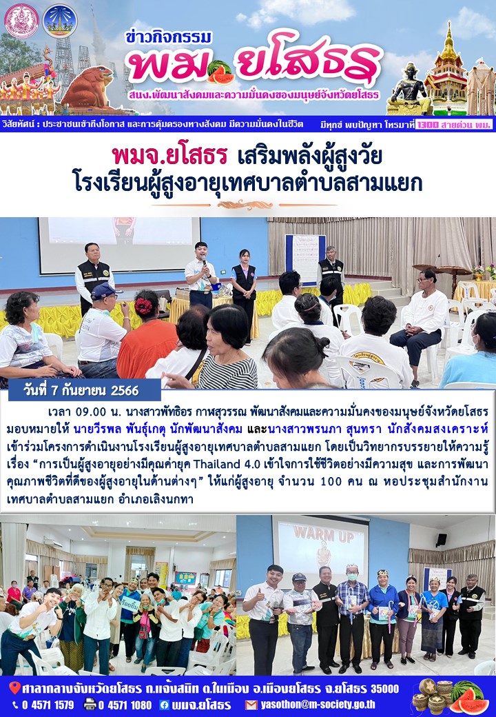วันที่ 11 ก.ย. 2566 (00:28 น.)วันที่ 7 กันยายน 2566 เวลา 09.00 น. นางสาวพัทธิอร กาฬสุวรรณ พัฒนาสังคมและความมั่นคงของมนุษย์จังหวัดโสธร มอบหมายให้ นายวีรพล พันธุ์กตุ นักพัฒนาสั่งคม และนางสาวพรนภา สุนทรา นักสั่งคมสงเคราะห์ เข้าร่วมโครงการดำเนินงานโรงเรียนผู้สูงอายุเทศบาลตำบลสามแยก โดยเป็นวิทยากรบรรยายให้ความรู้ เรื่อง "การเป็นผู้สูงอายุอย่างมีคุณค่ายุค Thailand 4.0 เข้าใจการใช้ชีวิตอย่างมีความสุข และการพัฒนา คุณภาพชีวิตที่ดีของผู้สูงอายุในด้านต่างๆ" ให้แก่ผู้สูงอายุ จำนวน 100 คน ณ หอประชุมสำนักงานเทศบาลตำบลสามแยก อำเภอเลิงนกทา