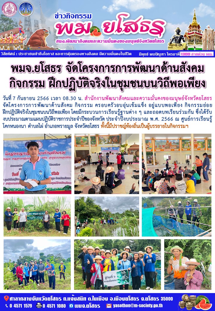 วันที่ 11 ก.ย. 2566 (00:30 น.)วันที่ 7 กันยายน 2566 เวลา 08.30 น. สำนักงานพัฒนาสังคมและความมั่นคงของมนุษย์จังหวัดยโสธร จัดโครงการการพัฒนาด้านสังคม กิจกรรม ครอบครัวอบอุ่นเข้มแข็ง อยู่แบบพอเพียง กิจกรรมย่อย ฝึกปฏิบัติจริงในชุมชนบนวิถีพอเพียง โดยมีกระบวนการเรียนรู้ฐานต่าง ๆ และถอดบทเรียนร่วมกัน ซึ่งได้รับงบประมาณตามแผนปฏิบัติราชการประจำปีของจังหวัด ประจำปีงบประมาณ พ.ศ. 2566 ณ ศูนย์การเรียนรู้โคกหนองนา ตำบลไผ่ อำเภอทรายมูล จังหวัดยโสธร ทั้งนี้มีปราชญ์ท้องถิ่นเป็นผู้บรรยายในกิจกรรมฯ