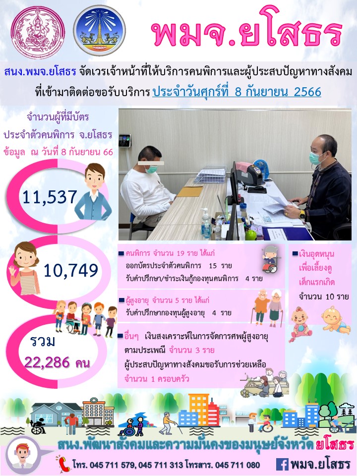 สนง.พมจ.ยโสธร จัดเวรเจ้าหน้าที่ให้บริการคนพิการและผู้ประสบปัญหาทางสังคม ที่เข้ามาติดต่อขอรับบริการ (8 กันยายน 2566)