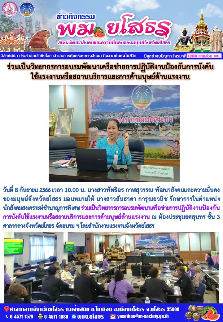 วันที่ 11 ก.ย. 2566 (00:44 น.)วันที่ 8 กันยายน 2566 เวลา 10.00 น. นางสาวพัทธิอร กาฬสุวรรณ พัฒนาสังคมและความมั่นคง ของมนุษย์จังหวัดยโสธร มอบหมายให้ นางสาวสันธาดา การุณยวนิช รักษาการในตำแหน่ง นักสังคมสงเคราะห์ชำนาญการพิเศษ ร่วมเป็นวิทยากรการอบรมพัฒนาเครือข่ายการปฏิบัติงานป้องกันการบังคับใช้แรงงานหรือสถานบริการและการค้ามนุษย์ด้านแรงงาน ณ ห้องประชุมยศสุนทร ชั้น 3 ศาลากลางจังหวัดยโสธร จัดอบรม ฯ โดยสำนักงานแรงงานจังหวัดยโสธร