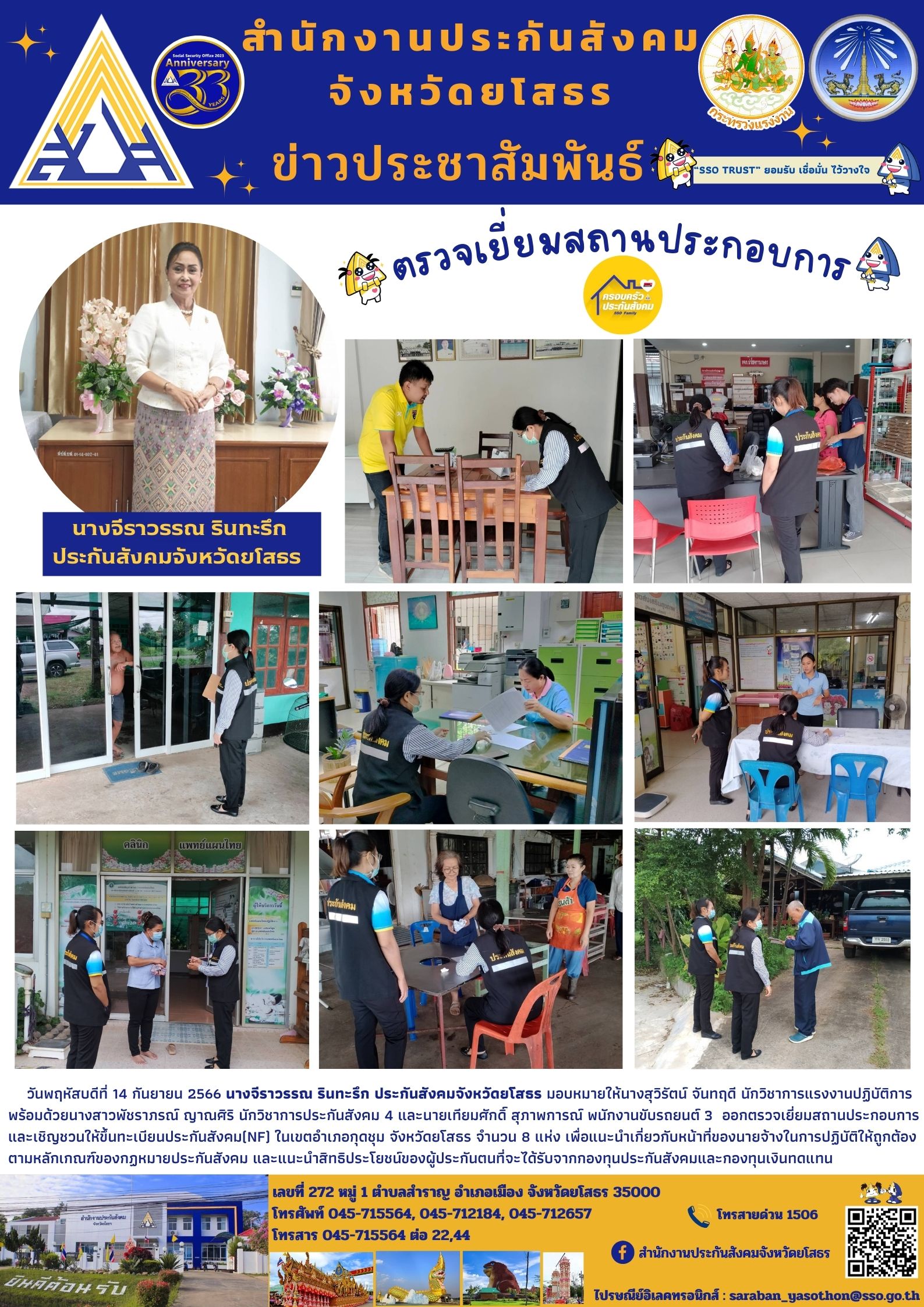 วันพฤหัสบดีที่ 14 กันยายน 2566 นางจีราวรรณ รินทะรึก ประกันสังคมจังหวัดยโสธร มอบหมายให้นางสุวิรัตน์ จันทฤดี นักวิชาการแรงงานปฏิบัติการ พร้อมด้วยนางสาวพัชราภรณ์ ญาณศิริ นักวิชาการประกันสังคม 4 และนายเทียมศักดิ์ สุภาพการณ์ พนักงานขับรถยนต์ 3 ออกตรวจเยี่ยมสถานประกอบการและเชิญชวนให้ขึ้นทะเบียนประกันสังคม(NF) ในเขตอำเภอกุดชุม จังหวัดยโสธร จำนวน 8 แห่ง เพื่อแนะนำเกี่ยวกับหน้าที่ของนายจ้างในการปฏิบัติให้ถูกต้องตามหลักเกณฑ์ของกฏหมายประกันสังคม และแนะนำสิทธิประโยชน์ของผู้ประกันตนที่จะได้รับจากกองทุนประกันสังคมและกองทุนเงินทดแทน- 6 เม.ย.2569