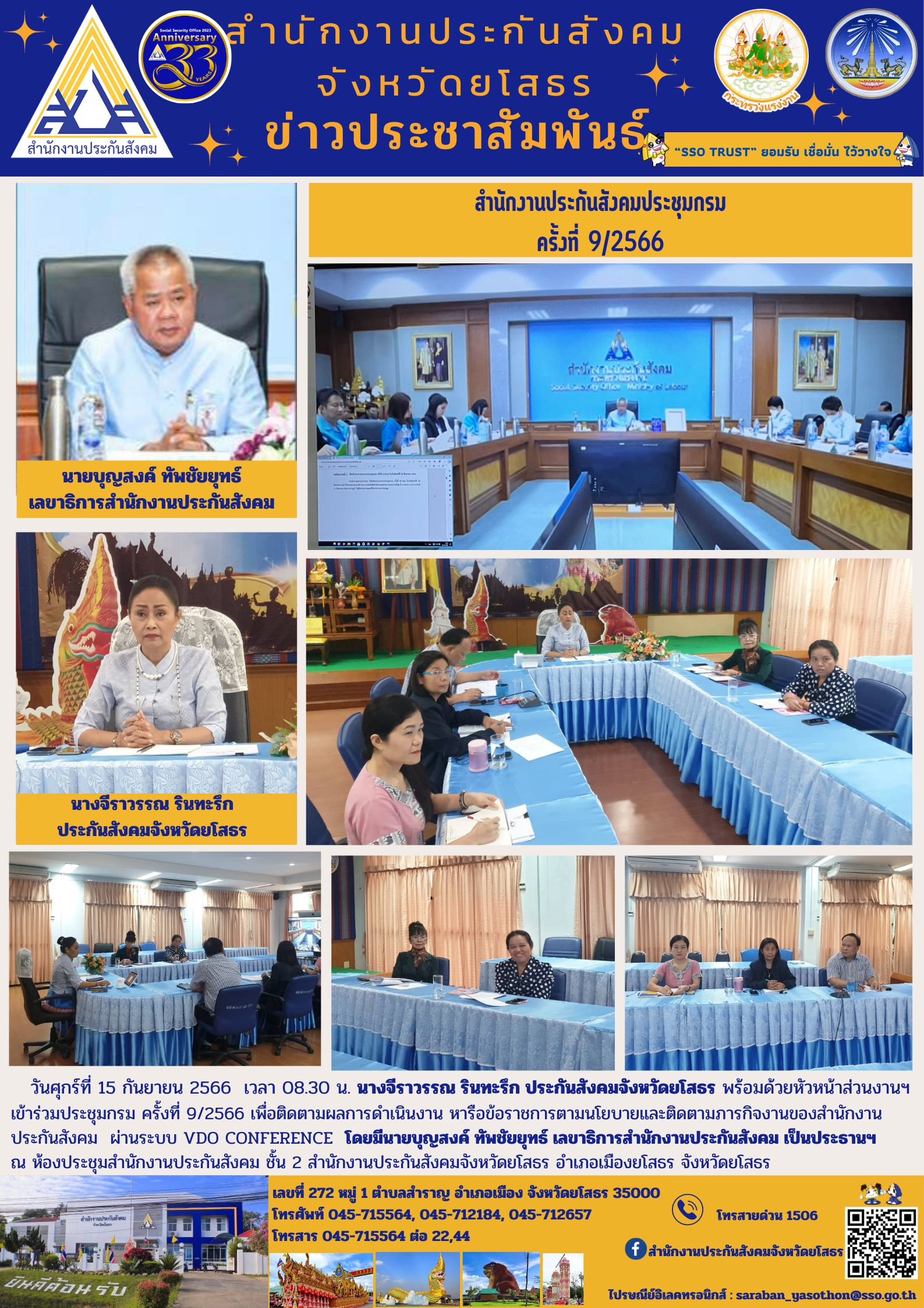 ประกันสังคมจังหวัดยโสธร พร้อมด้วยหัวหน้าส่วนงานฯ เข้าร่วมประชุมกรม ครั้งที่ 9/2566 เพื่อติดตามผลการดำเนินงาน หารือข้อราชการตามนโยบายและติดตามภารกิจงานของสำนักงานประกันสังคม ผ่านระบบ VDO CONFERENCE โดยมีนายบุญสงค์ ทัพชัยยุทธ์ เลขาธิการสำนักงานประกันส