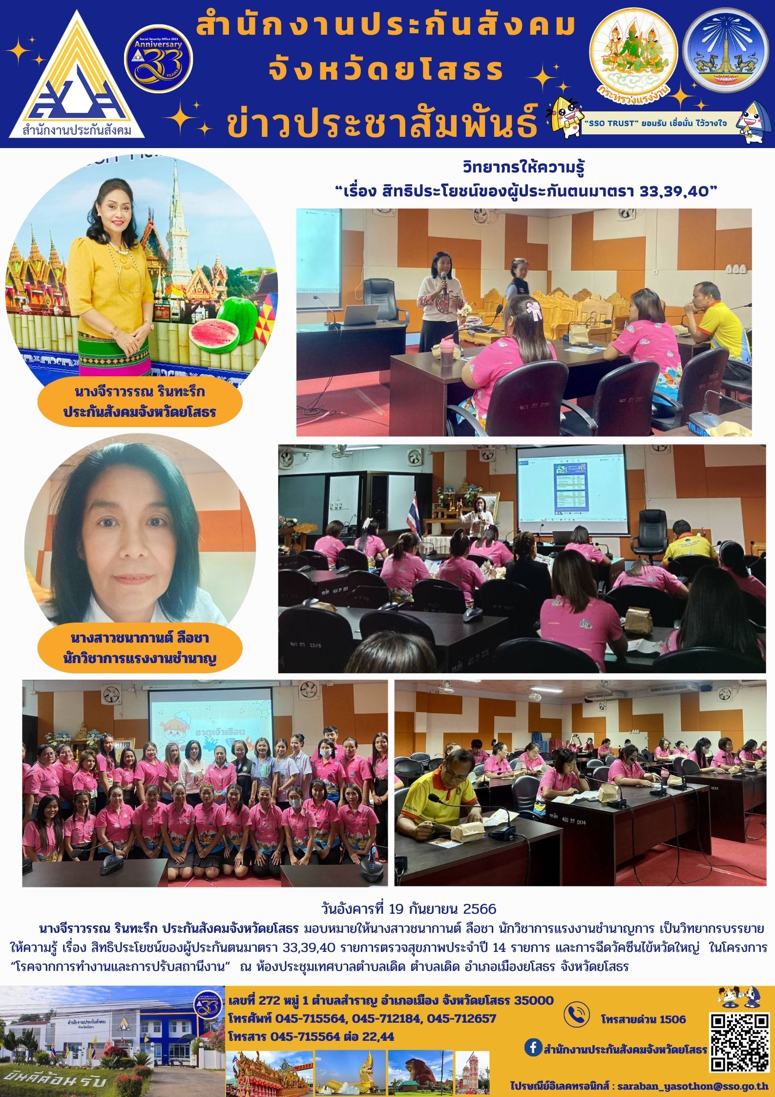 ประกันสังคมจังหวัดยโสธร มอบหมายให้นางสาวชนากานต์ ลือชา นักวิชาการแรงงานชำนาญการ เป็นวิทยากรบรรยาย ให้ความรู้ เรื่อง สิทธิประโยชน์ของผู้ประกันตนมาตรา 33,39,40 รายการตรวจสุขภาพประจำปี 14 รายการ และการฉีดวัคซีนไข้หวัดใหญ่ ในโครงการ “โรคจากการทำงานและกา