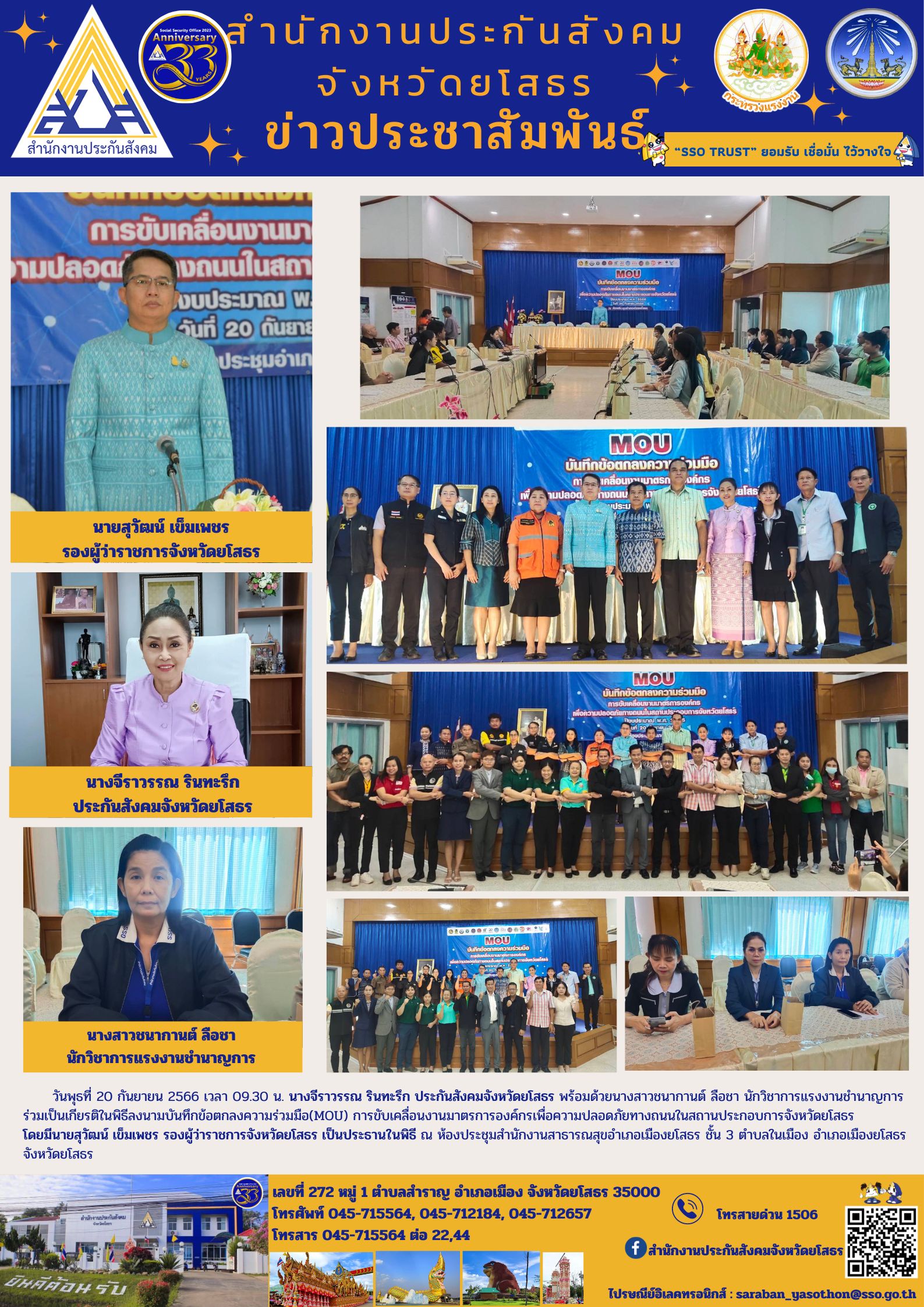 ประกันสังคมจังหวัดยโสธร พร้อมด้วยนางสาวชนากานต์ ลือชา นักวิชาการแรงงานชำนาญการ ร่วมเป็นเกียรติในพิธีลงนามบันทึกข้อตกลงความร่วมมือ(MOU) การขับเคลื่อนงานมาตรการองค์กรเพื่อความปลอดภัยทางถนนในสถานประกอบการจังหวัดยโสธร โดยมีนายสุวัฒน์ เข็มเพชร รองผู้ว่า