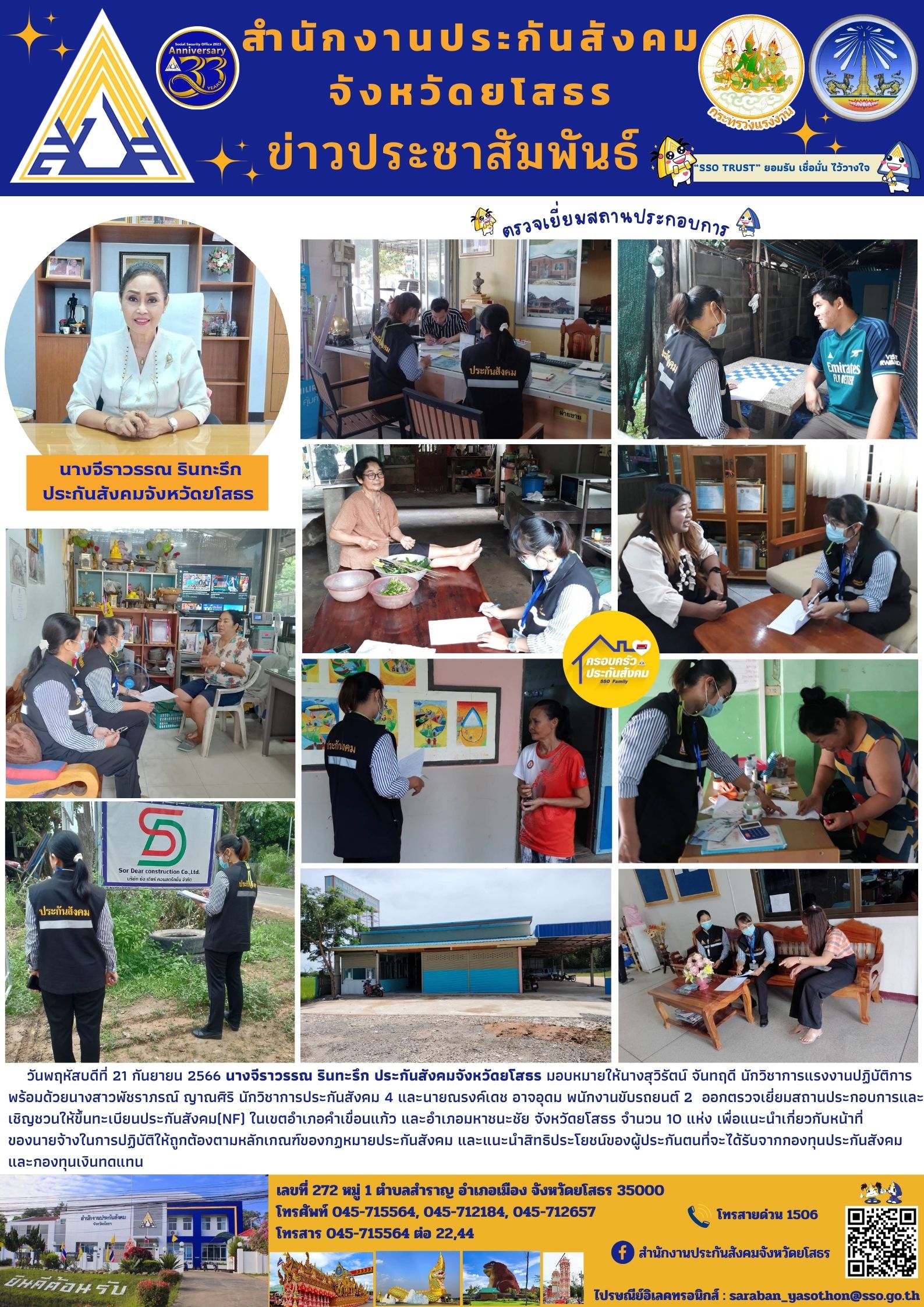 ฮวันพฤหัสบดีที่ 21 กันยายน 2566 นางจีราวรรณ รินทะรึก ประกันสังคมจังหวัดยโสธร มอบหมายให้นางสุวิรัตน์ จันทฤดี นักวิชาการแรงงานปฏิบัติการ พร้อมด้วยนางสาวพัชราภรณ์ ญาณศิริ นักวิชาการประกันสังคม 4 และนายณรงค์เดช อาจอุดม พนักงานขับรถยนต์ 2 ออกตรวจเยี่ยมสถานประกอบการและเชิญชวนให้ขึ้นทะเบียนประกันสังคม(NF) ในเขตอำเภอคำเขื่อนแก้ว และอำเภอมหาชนะชัย จังหวัดยโสธร จำนวน 10 แห่ง เพื่อแนะนำเกี่ยวกับหน้าที่