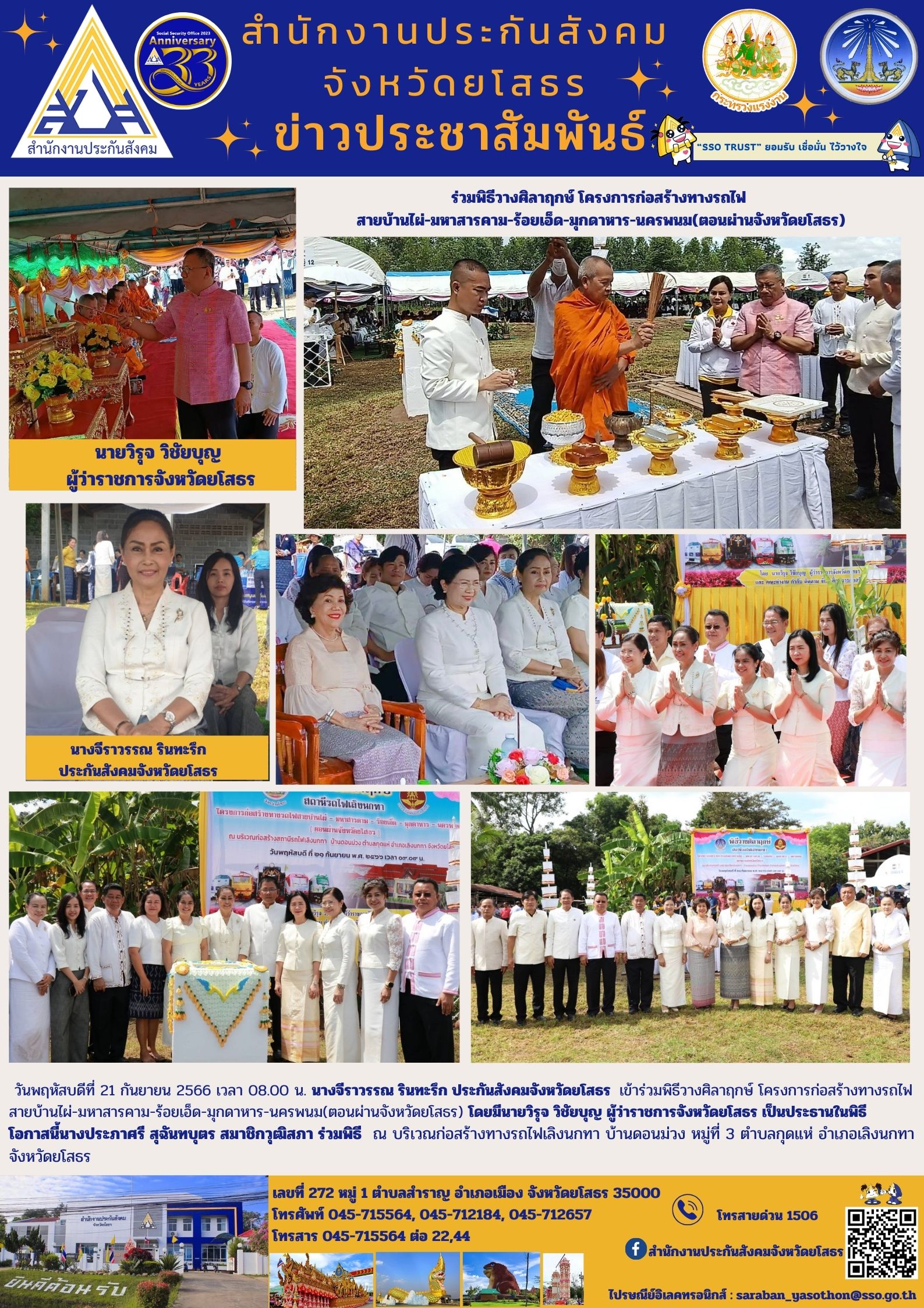 วันพฤหัสบดีที่ 21 กันยายน 2566 เวลา 08.00 น. นางจีราวรรณ รินทะรึก ประกันสังคมจังหวัดยโสธร เข้าร่วมพิธีวางศิลาฤกษ์ โครงการก่อสร้างทางรถไฟ
