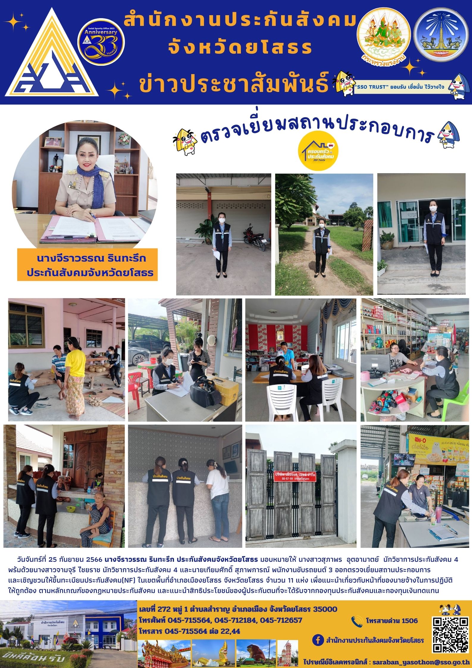 ประกันสังคมจังหวัดยโสธร มอบหมายให้ เจ้าหน้าที่ฯออกตรวจเยี่ยมสถานประกอบการ และเชิญชวนให้ขึ้นทะเบียนประกันสังคม(NF) ในเขตพื้นที่อำเภอเมืองยโสธร จังหวัดยโสธร จำนวน 11 แห่ง เพื่อแนะนำเกี่ยวกับหน้าที่ของนายจ้างในการปฏิบัติ ให้ถูกต้อง ตามหลักเกณฑ์ของกฏหม