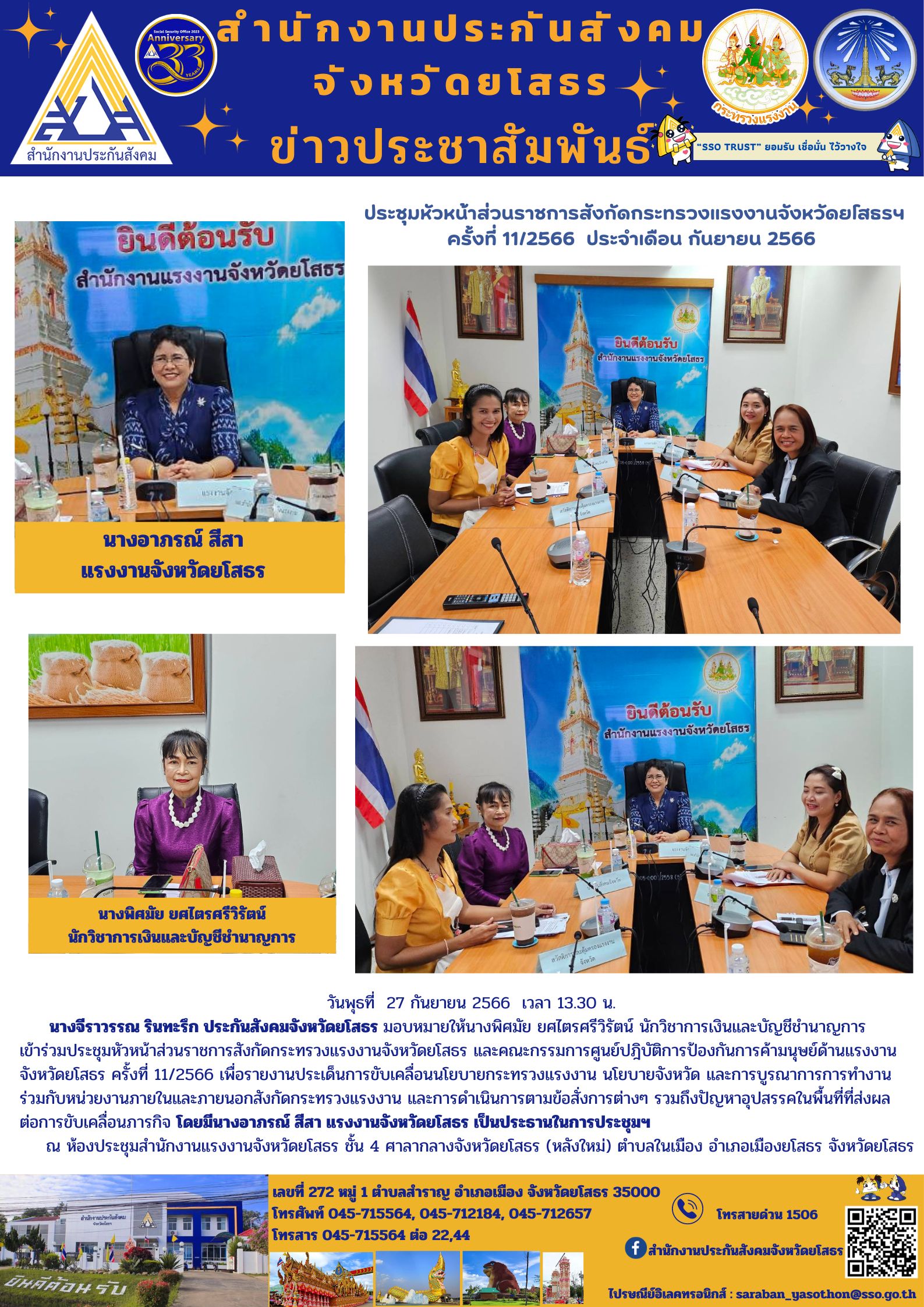 ประกันสังคมจังหวัดยโสธร มอบหมายให้นางพิศมัย ยศไตรศรีวิรัตน์ นักวิชาการเงินและบัญชีชำนาญการ เข้าร่วมประชุมหัวหน้าส่วนราชการสังกัดกระทรวงแรงงานจังหวัดยโสธร และคณะกรรมการศูนย์ปฎิบัติการป้องกันการค้ามนุษย์ด้านแรงงานจังหวัดยโสธร ครั้งที่ 11/2566 เพื่อราย