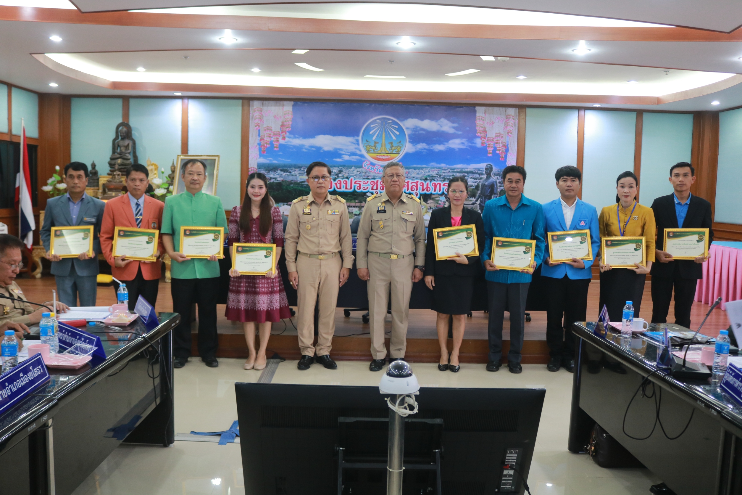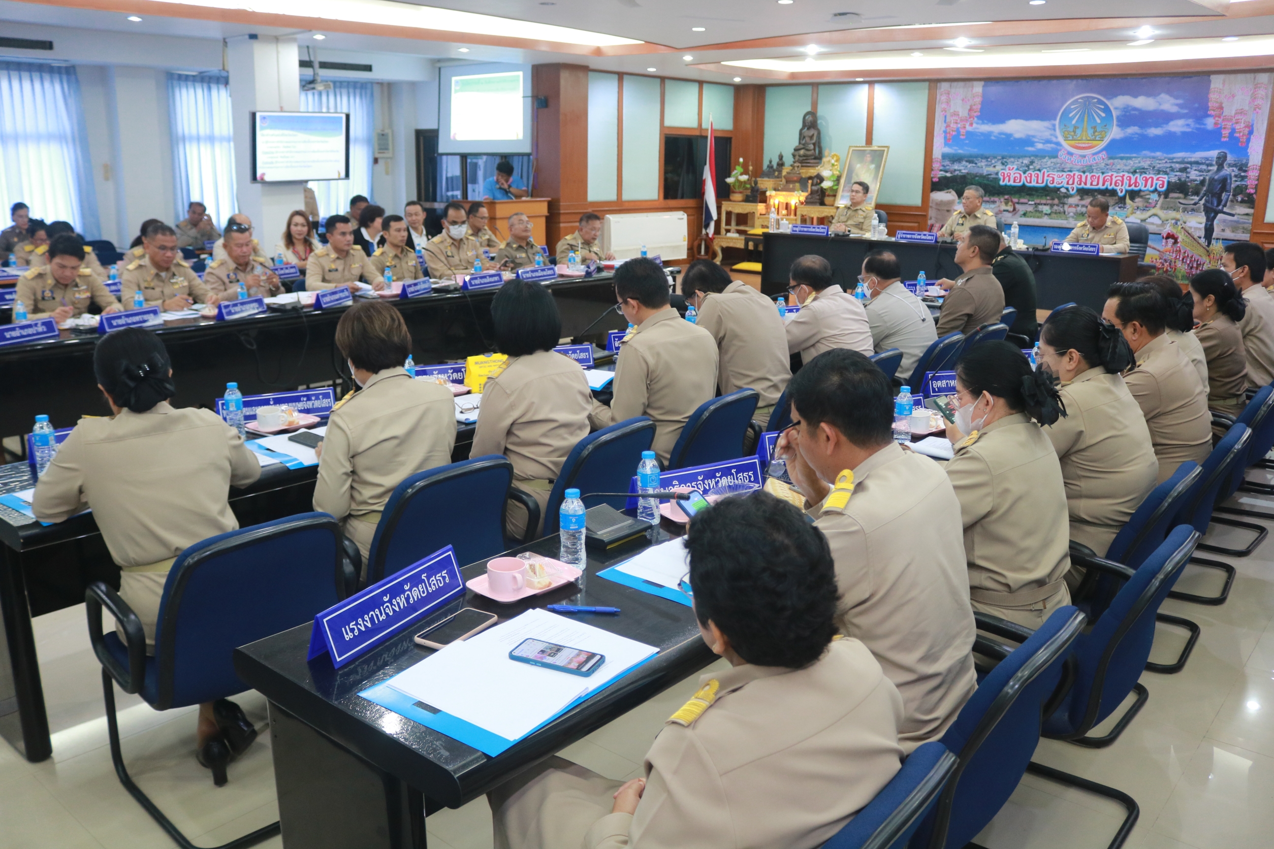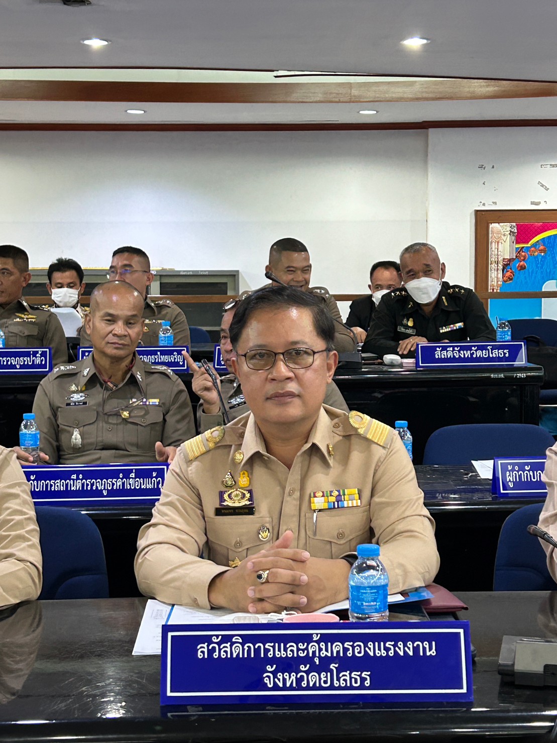 วันที่ 29 ก.ย. 2566 (09:07 น.)วันพฤหัสบดีที่ 28 กันยายน 2566 เวลา 09.30 น. นายพนมพร ชวนอุดม สวัสดิการและคุ้มครองแรงงานจังหวัดยโสธร ร่วมการประชุมคณะกรมการจังหวัด หัวหน้าส่วนราชการ ประจำจังหวัด และนายอำเภอ จังหวัดยโสธร ครั้งที่ 9/2566 ประจำเดือนกันยายน 2566 ณ ห้องประชุมยศสุนทร ชั้น 3 ศาลากลางจังหวัดยโสธร (หลังใหม่) โดยมีนายวิรุจ วิชัยบุญ ผู้ว่าราชการจังหวัดยโสธร เป็นประธานการประชุม เพื่อขับเคลื่อนและติดตามการดำเนินงานตามภารกิจที่สำคัญของจังหวัดยโสธร รวมถึงรับทราบสถานกาณ์ที่สำคัญของจังหวัดในการขับเคลื่อนการดำเนินงานตามภารกิจ ก่อนการประชุม นายวิรุจ วิชัยบุญ ผู้ว่าราชการจังหวัดยโสธร ให้เกียรติมอบเกียรติบัตรแก่สถานศึกษาในจังหวัดยโสธรที่เข้าร่วมกิจกรรม และผ่านเกณฑ์การประเมินจนได้รับรางวัลสถานศึกษาปลอดภัยประจำปี 2566 จำนวน 27 แห่ง