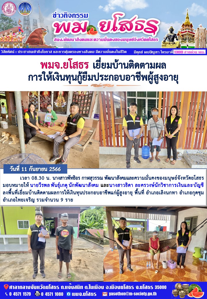 พมจ.ยโสธร เยี่ยมบ้านติดตามผล การให้เงินทุนกู้ยืมประกอบอาชีพผู้สูงอายุ (11 กันยายน 2566)