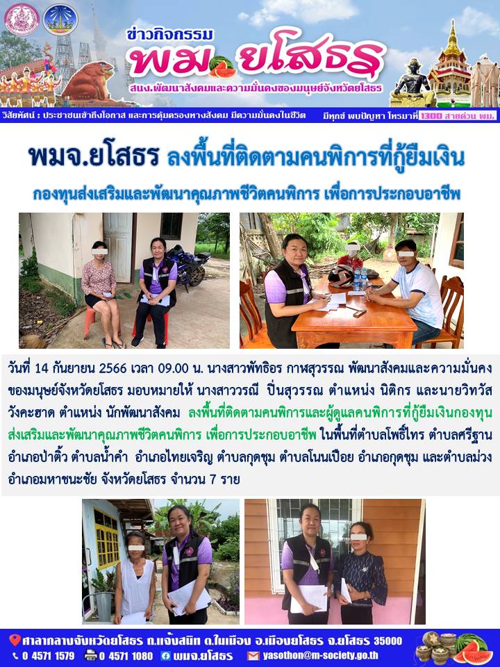 วันที่ 1 ต.ค. 2566 (18:04 น.)วันที่ 14 กันยายน 2566 เวลา 09.00 น. นางสาวพัทธิอร กาฬสุวรรณ พัฒนาสังคมและความมั่นคงของมนุษย์จังหวัดยโสธร มอบหมายให้ นางสาววรณี ปิ่นสุวรรณ ตำแหน่ง นิติกร และนายวิทวัส วังคะฮาด ตำแหน่ง นักพัฒนาสังคม ลงพื้นที่ติดตามคนพิการและผู้ดูแลคนพิการที่กู้ยืมเงินกองทุนส่งเสริมและพัฒนาคุณภาพชีวิตคนพิการ เพื่อการประกอบอาชีพ ในพื้นที่ตำบลโพธิ์ไทร ตำบลศรีฐาน อำเภอป่าติ้ว ตำบลน้ำคำ อำเภอไทยเจริญ ตำบลกุดชุม ตำบลโนนเปือย อำเภอกุดชุม และตำบลม่วง อำเภอมหาชนะชัย จังหวัดยโสธร จำนวน 7 ราย